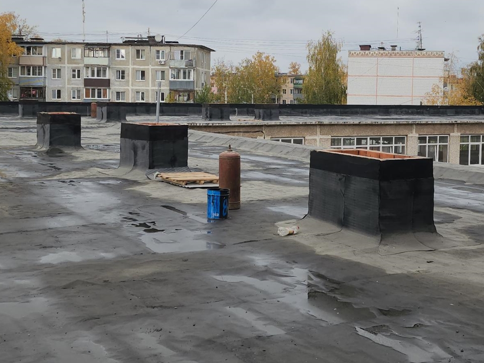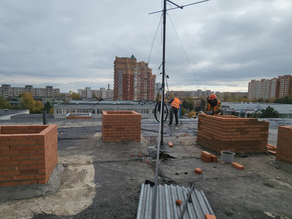 На крыше возводятся современные вентиляционные шахты. Бригада из 18 человек и девять единиц техники работают по графику. Ремонт ведется в рамках нацпроекта «Молодежь и дети».