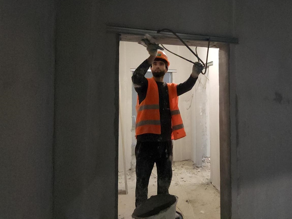 Сейчас рабочие активно занимаются отделкой: наносят штукатурку и шпатлевку на новые перегородки.