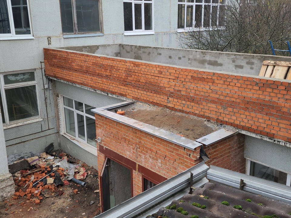 Следующим шагом станет пробивка проемов для эвакуационных выходов: это критически важно для соблюдения современных норм пожарной безопасности. Кроме внутренних работ, строители завершили устройство парапетов на кровле, они уже оштукатурены.