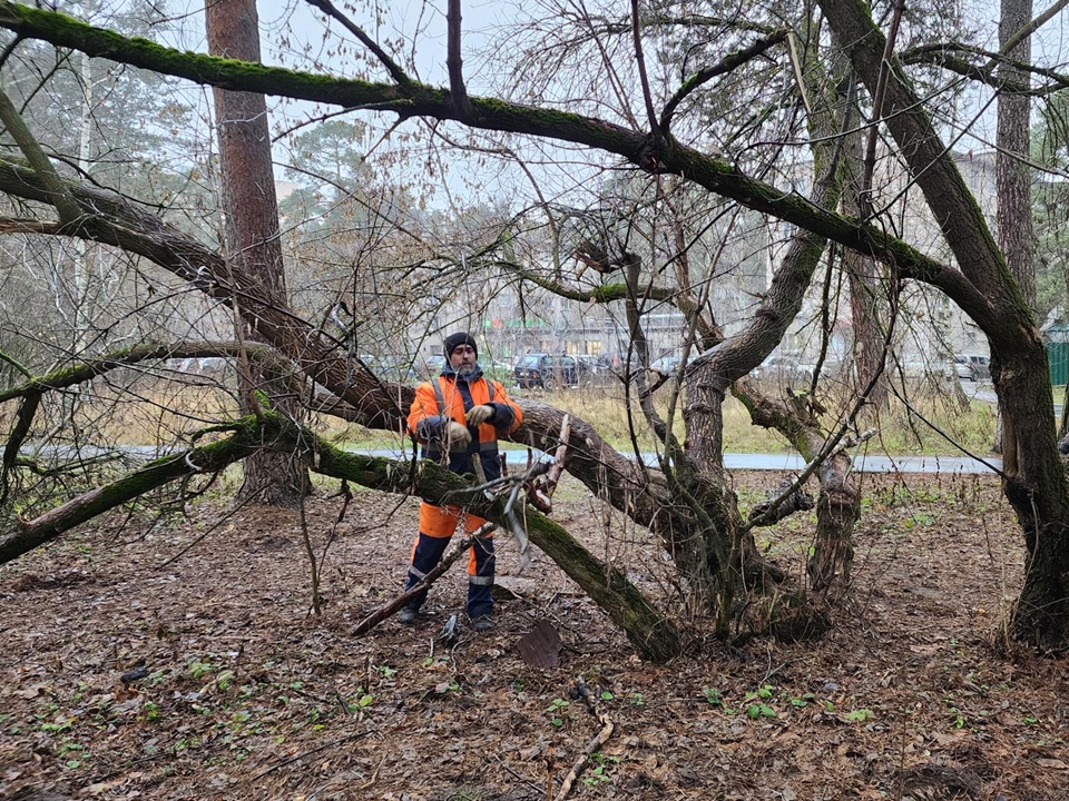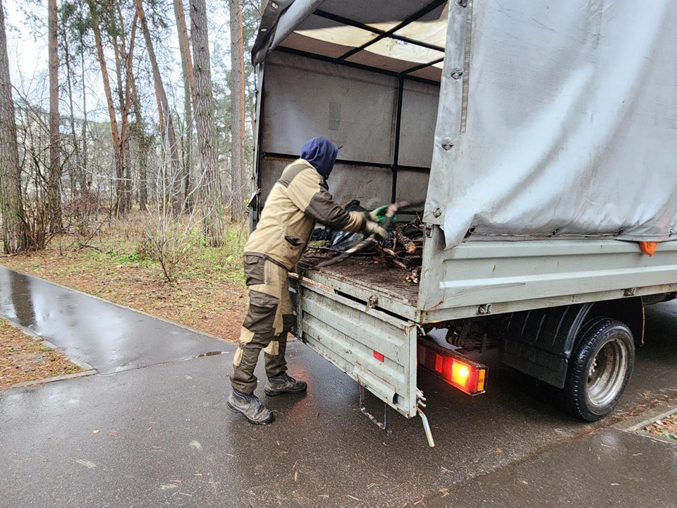 На первом этапе удалось вывезти ветви, которые без труда помещались в кузов машины. Однако среди завалов обнаружились и более серьезные препятствия — сухие стволы деревьев. Эти объекты требуют специальной обработки: их передадут бригаде лесорубов, которые произведут распиловку.