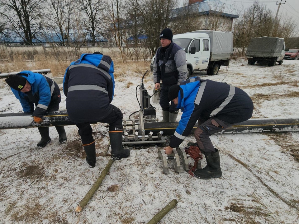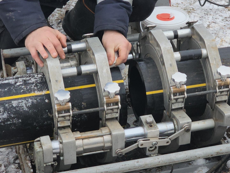 Сейчас рабочие заняты соединением 13‑метровых отрезков полиэтиленовой трубы. Диаметр трубы 225 миллиметров, соединение выполняется методом стыковой сварки. В бригаде трудятся два машиниста‑экскаваторщика, два слесаря, два водителя и подсобный рабочий.