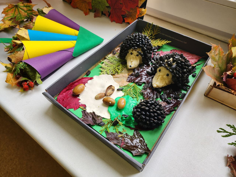 Прост в исполнении и ежик: из белого пластилина делают голову и лапки, животик, соединяют их. Из серого пластилина лепят иголки, раскатывают и прикрепляют детали мордочки, украшают ежика листиком и ягодами. Хорошо получаются из пластилина и деревья.
