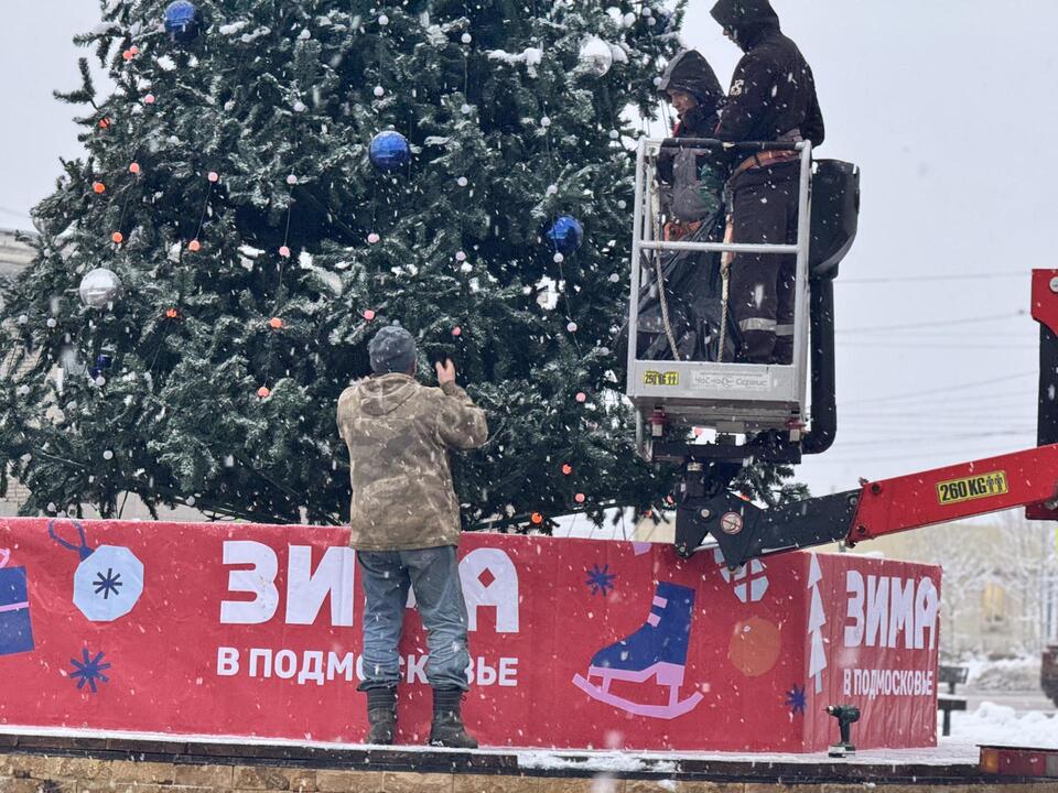 Сотрудники МБУ «Благоустройство Шаховская» устанавливают новогоднюю елку возле здания администрации на улице 1-я Советская. Обычно этот традиционный ритуал проводится в конце ноября.