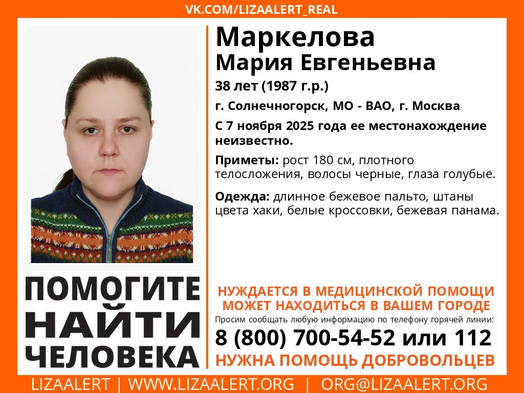 В Солнечногорске ведутся поиски 38-летней женщины, местонахождение которой неизвестно с 7 ноября 2025 года. По информации поискового отряда «ЛизаАлерт», она может находиться не только в Солнечногорске, но и на территории Московской области, в Восточном административном округе или в городе Москве.
