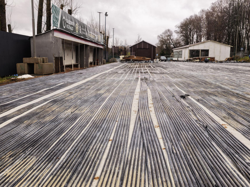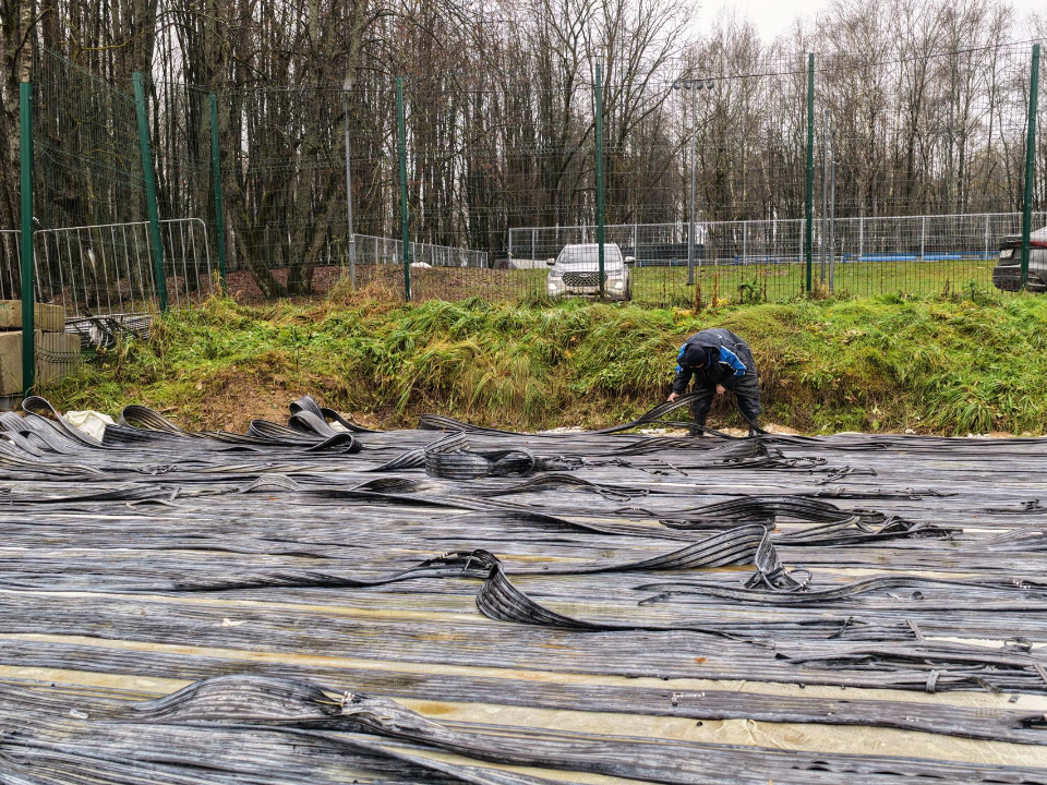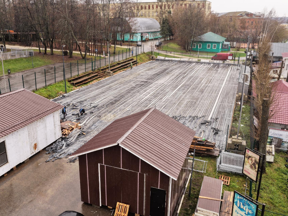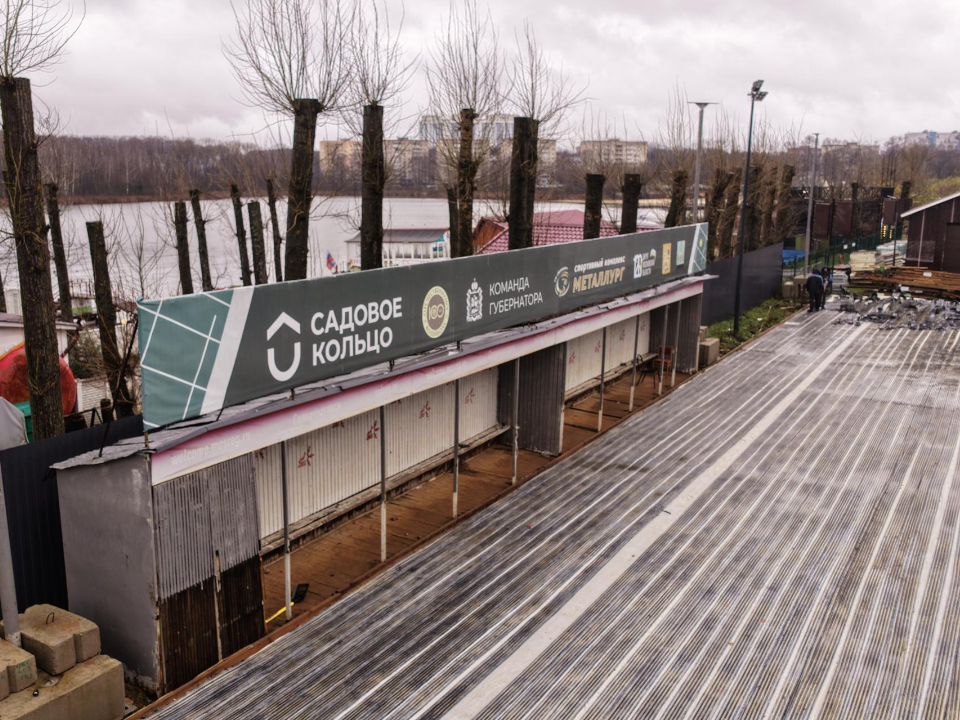На берегу озера Сенеж специалисты производят монтаж городского катка с искусственным льдом, который не подведет, несмотря на капризы погоды. Территорию будущего корта огородили и завезли все необходимые материалы.