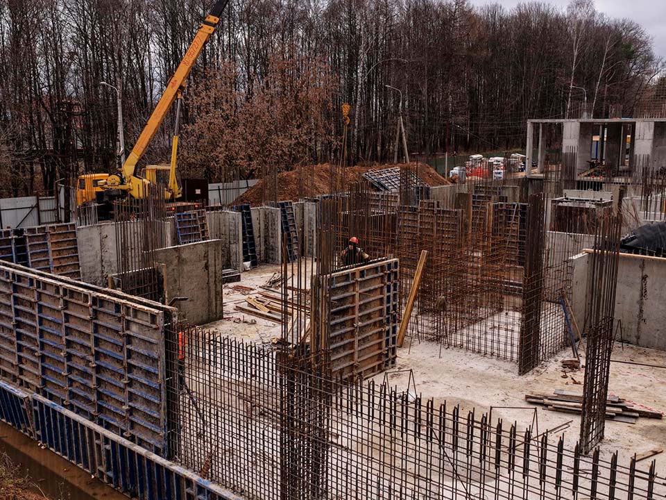 На строительной площадке в настоящее время ведутся бетонные работы: рабочие заливают перекрытия и устанавливают опалубку для следующих этажей. Все работы идут по утвержденному графику, без отставаний.