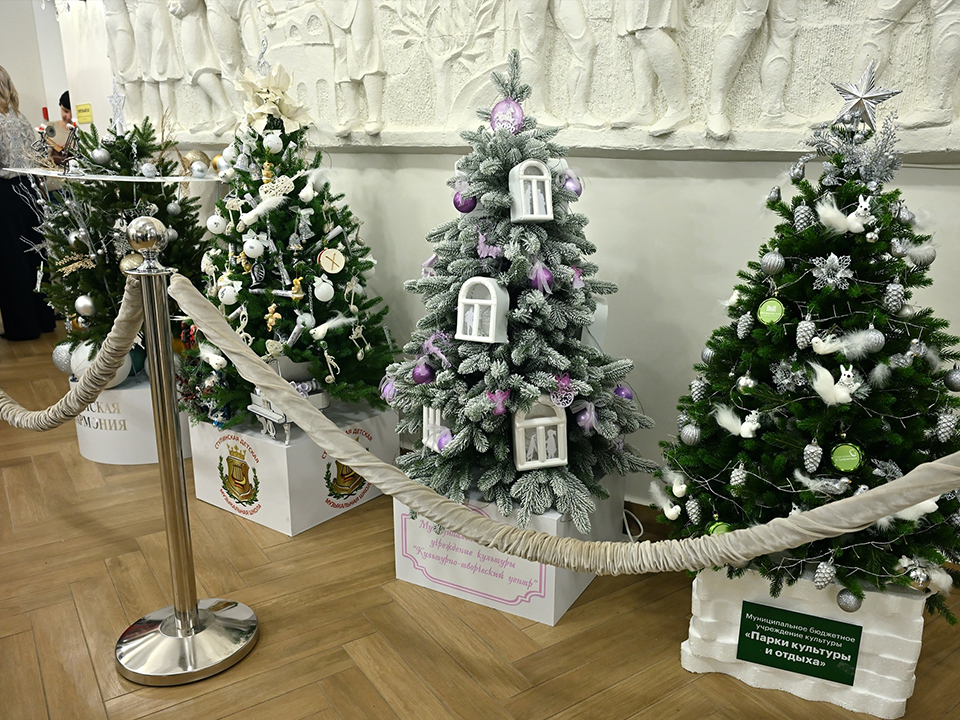 Историко-краеведческий музей оформил дерево как памятник эпохе: бумажные флажки, шпиль и узнаваемые городские пейзажи на шарах. Парки принесли в зал уголок леса с шишками и птицами, а Дворец культуры использовал яркие цвета и элементы брендбука. Школа искусств представила сцену из «Щелкунчика», где золотая ель служит фоном для битвы с Мышиным королем.