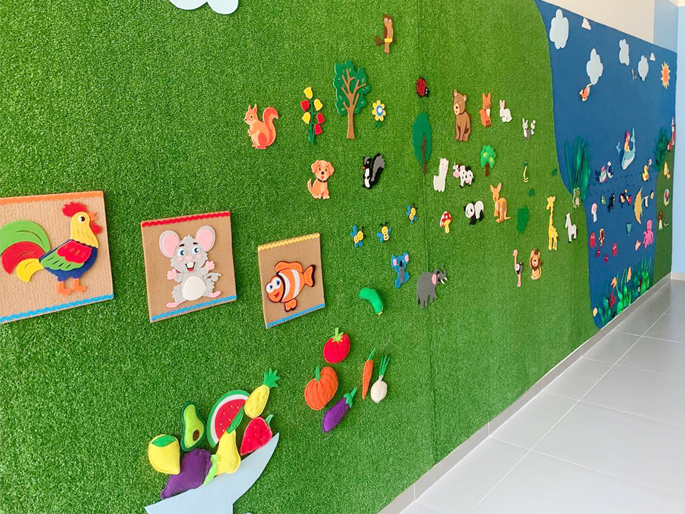 Теперь эти стены помогают в работе и развитии. На фетровых панно можно изучать математику и развивать речь, собирать картины и целые сюжеты. В планах — оформить холл по географии с огромной интерактивной картой и холл космоса с планетами и большим телескопом.