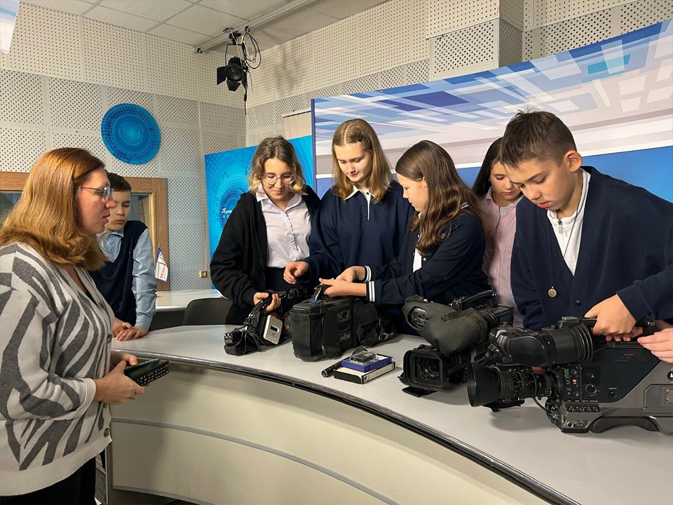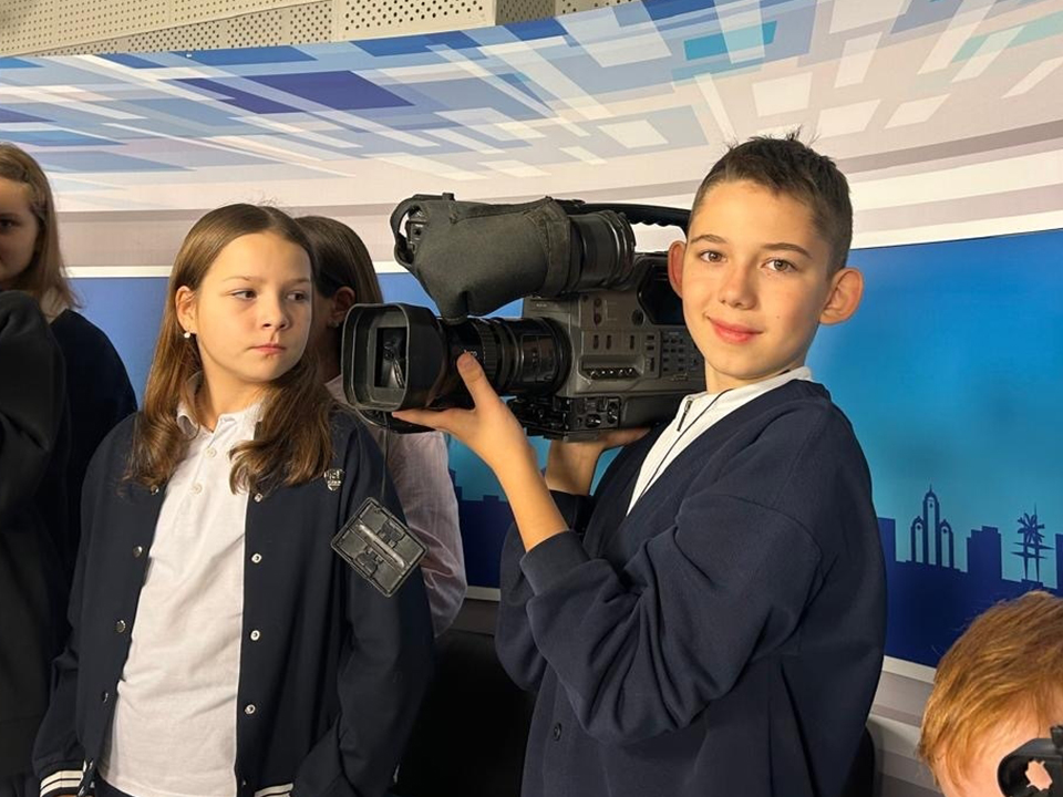 Школьникам показали, как рождается телевизионный продукт — от нажатия кнопки на камере до готового сюжета. Они испытали на себе тяжесть операторской работы, подержав в руках профессиональную технику, и попробовали силы в роли диктора перед камерой.