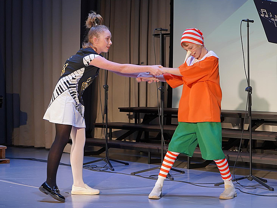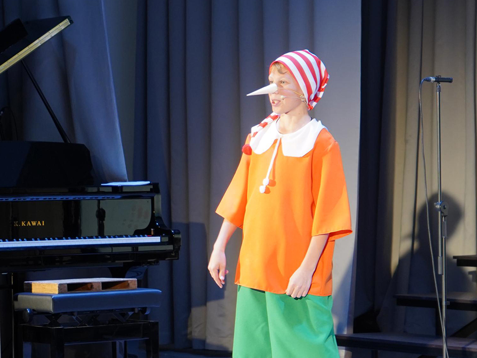 Концертная программа была представлена в формате музыкальной сказки. Роли феи музыки, Буратино и фальшивой ноты исполнили учащиеся театрального отделения и старших классов. Юные зрители активно помогали героям преодолевать задания сюжета.