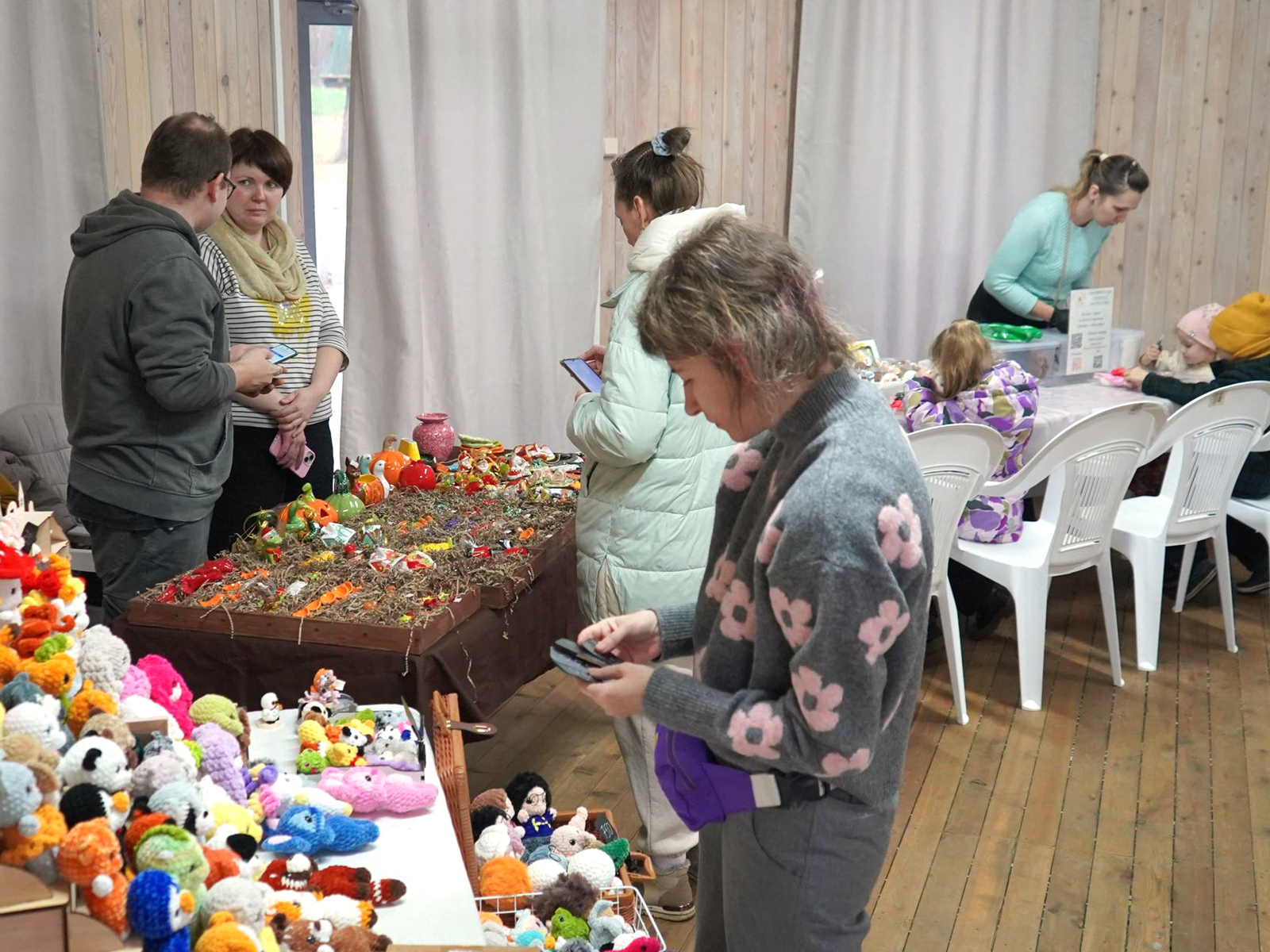 Хотя небольшой дождь внес коррективы в план, организаторы сумели провести все запланированные активности. Выставку работ местных рукодельниц, а также мастер-классы и настольные игры перенесли под крышу павильона, расположенного на детской площадке.