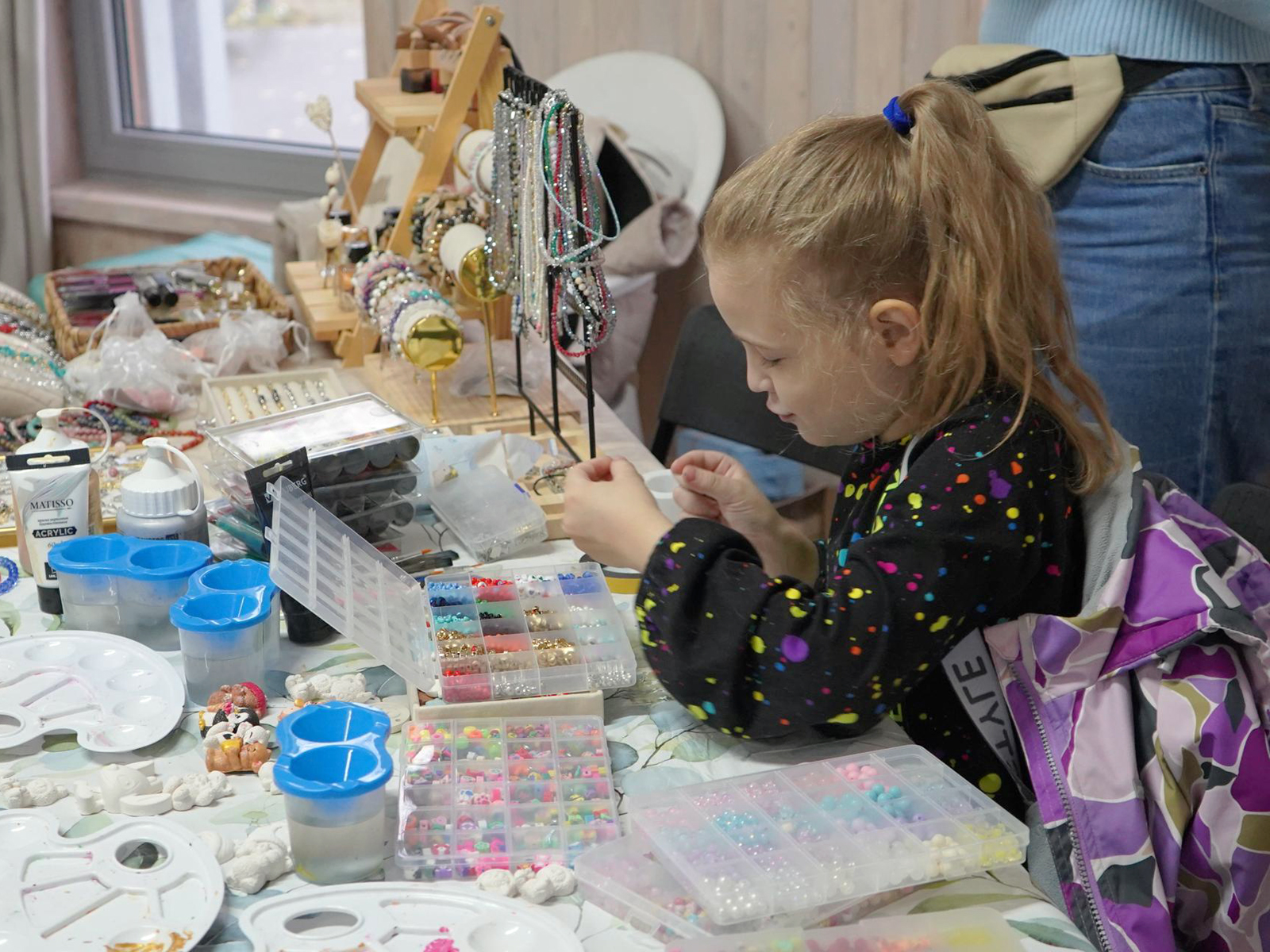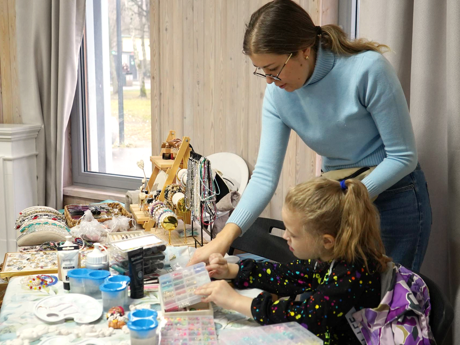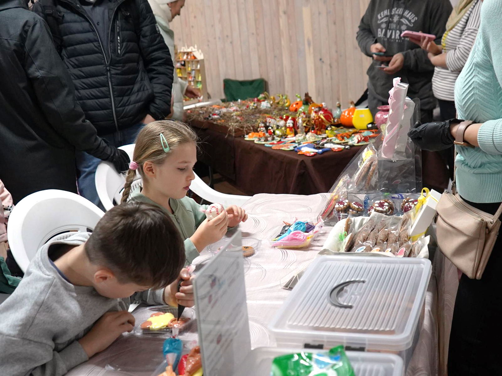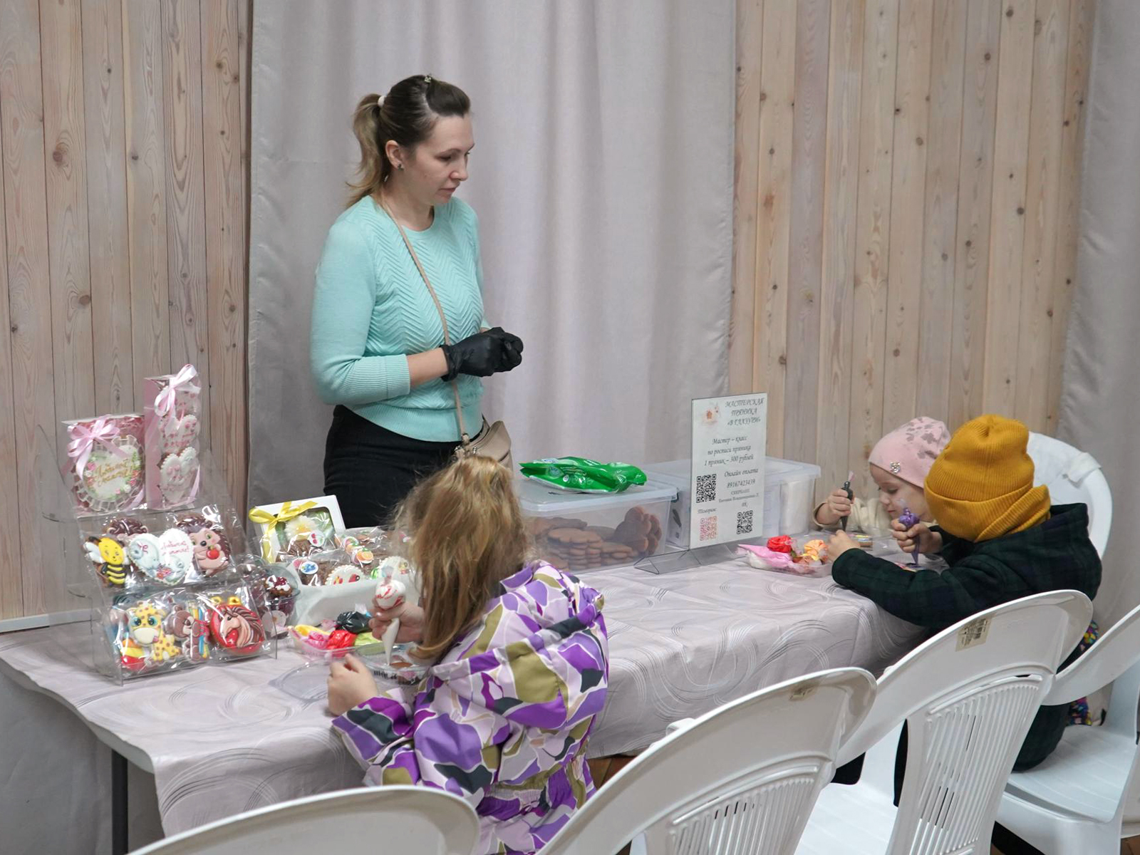 В крытом помещении с большим успехом прошли несколько занятий. Одним из самых популярных стал мастер-класс по росписи пряников «Вкусная осень», который собрал множество гостей. Также желающие могли заняться пятнашками. В это же время работала «Осенняя ярмарка», где местные мастерицы представили свои работы: от вязаных и деревянных игрушек до керамических новогодних украшений и посуды.