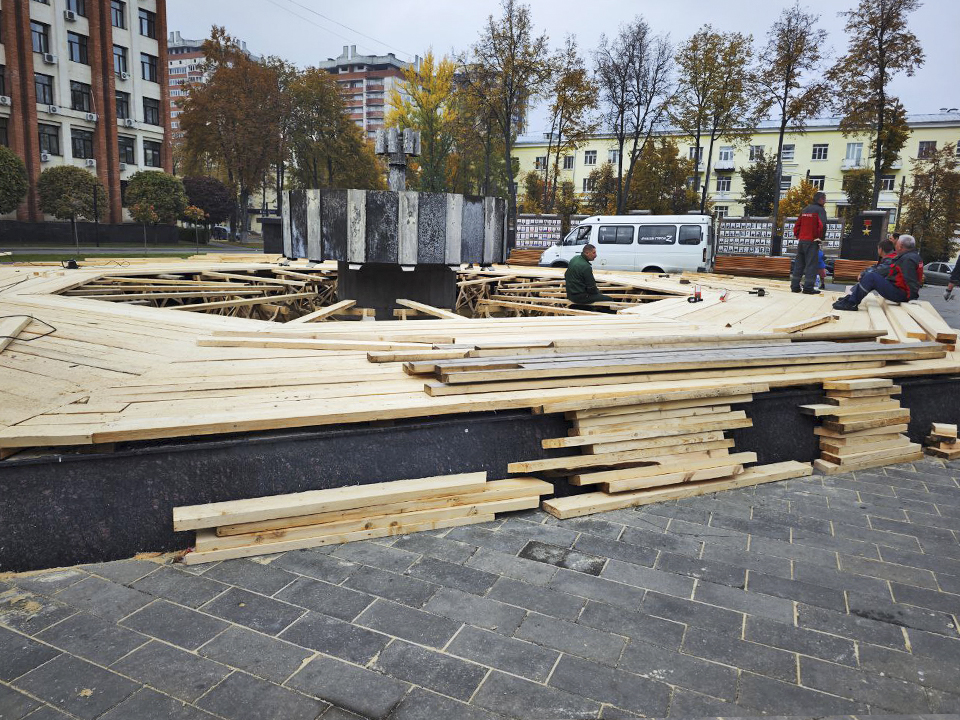 Главный фонтан города, расположенный у здания администрации, уже частично подготовлен к зиме. На его чаше смонтировали деревянный настил. Как и в прошлом году, эту площадку планируют использовать для размещения световых новогодних инсталляций, которые появятся здесь ближе к новогодним праздникам.