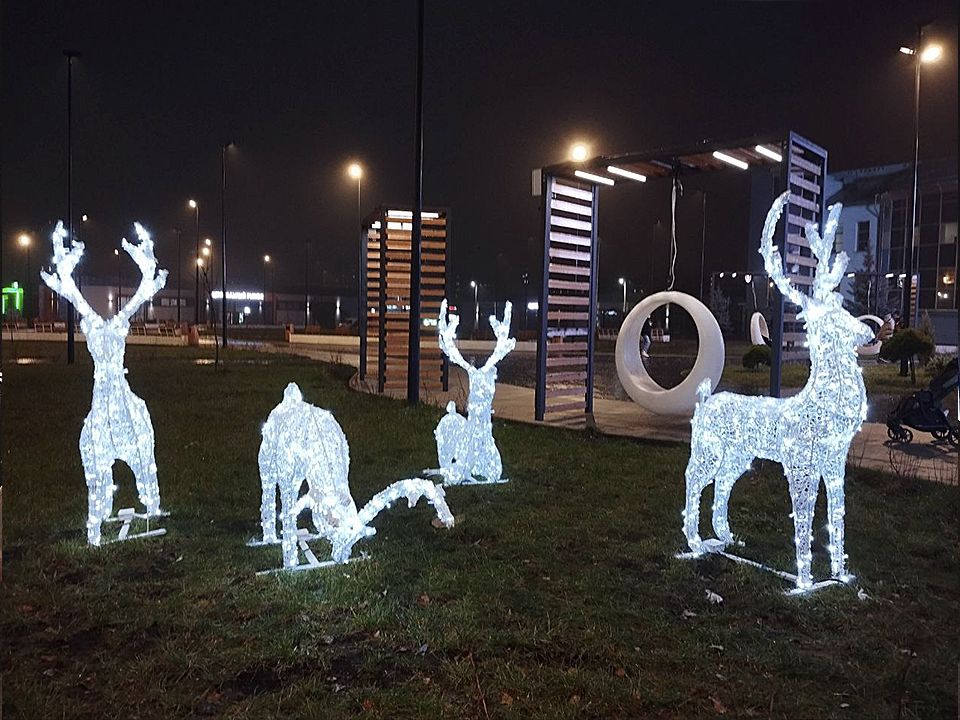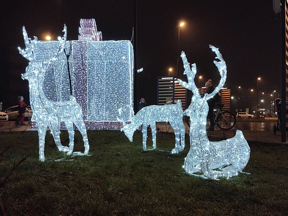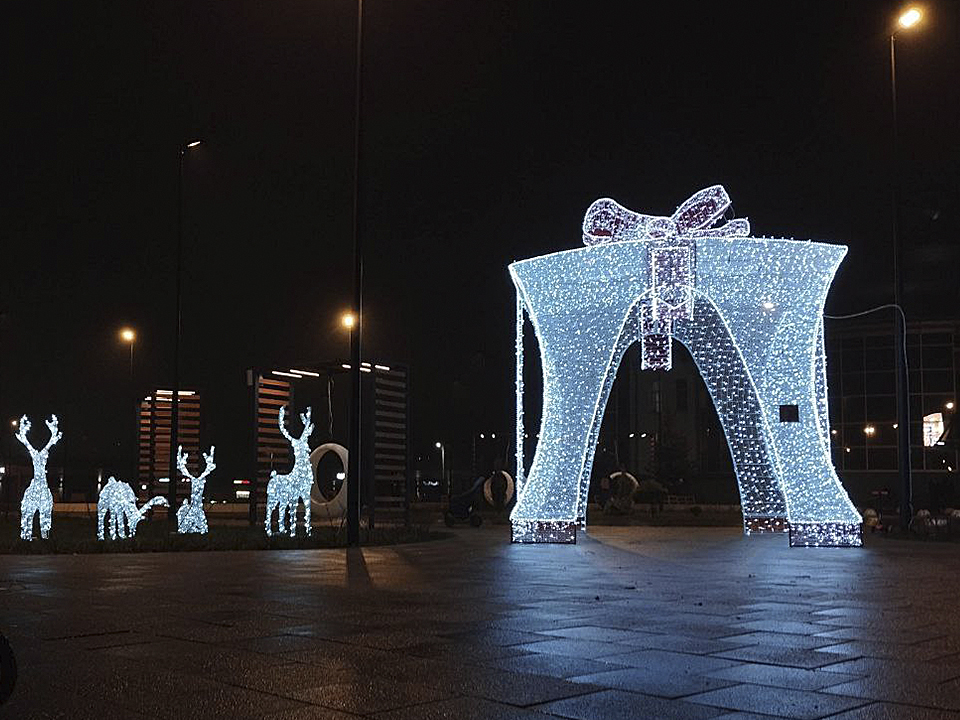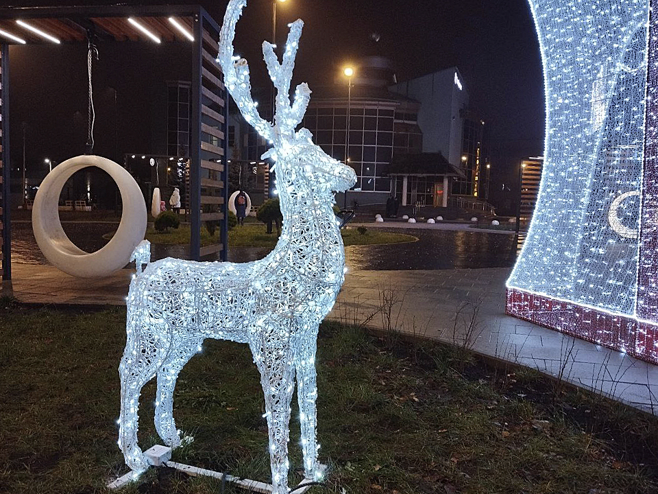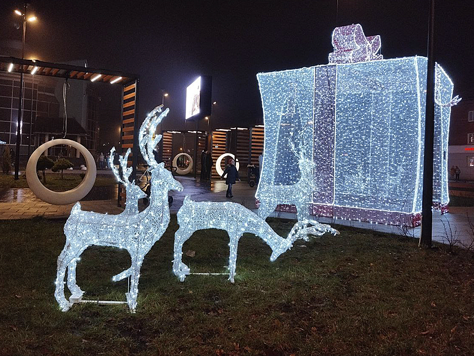 Вход в сквер теперь оформлен как огромная подарочная коробка. По обе стороны от этого портала расположились светящиеся фигуры оленей — по четыре с каждой стороны.