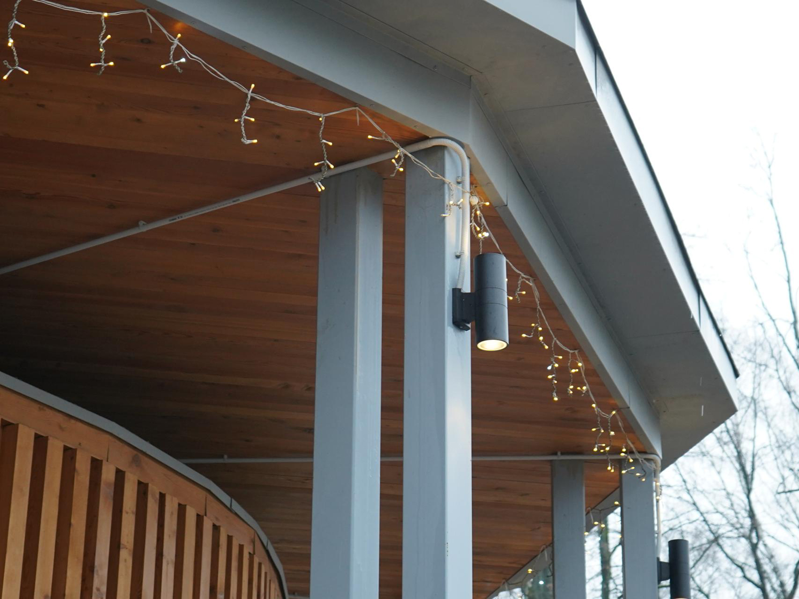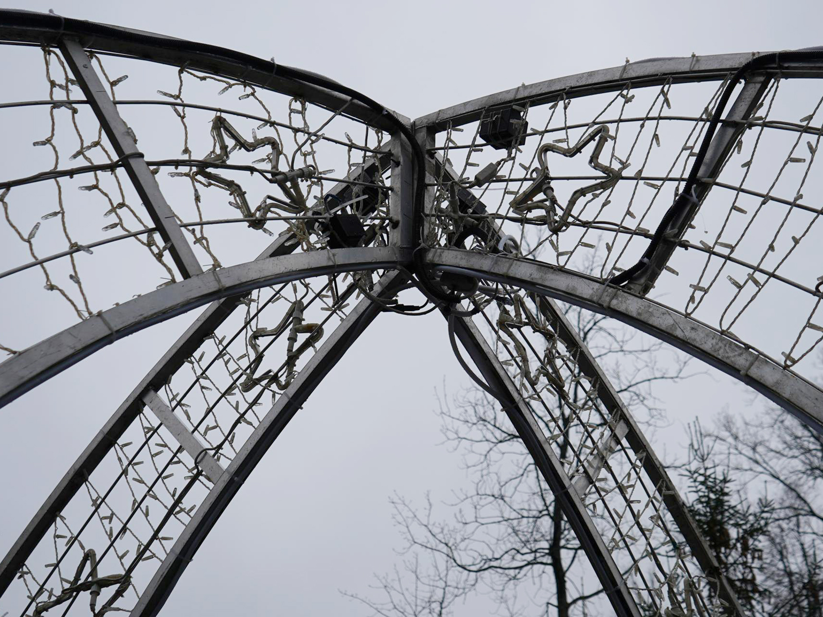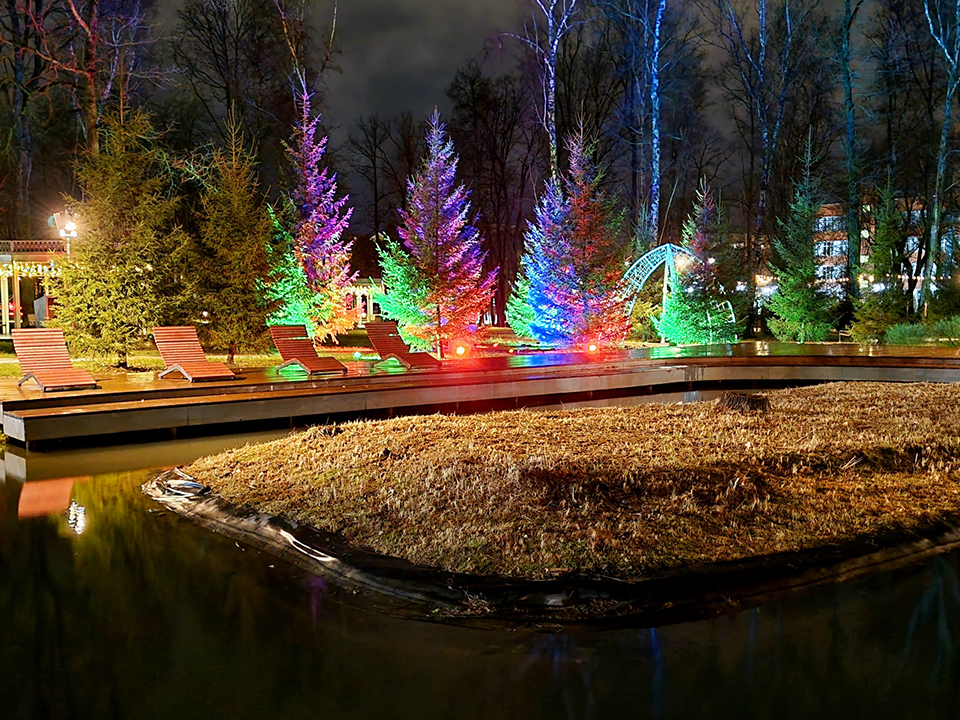 Сотрудники парка разработали новую концепцию освещения для аллеи, ведущей к пруду. Для дюжины елей, растущих вдоль дорожки, смонтировали разноцветную нижнюю подсветку, а также установили арку с гирляндами.
