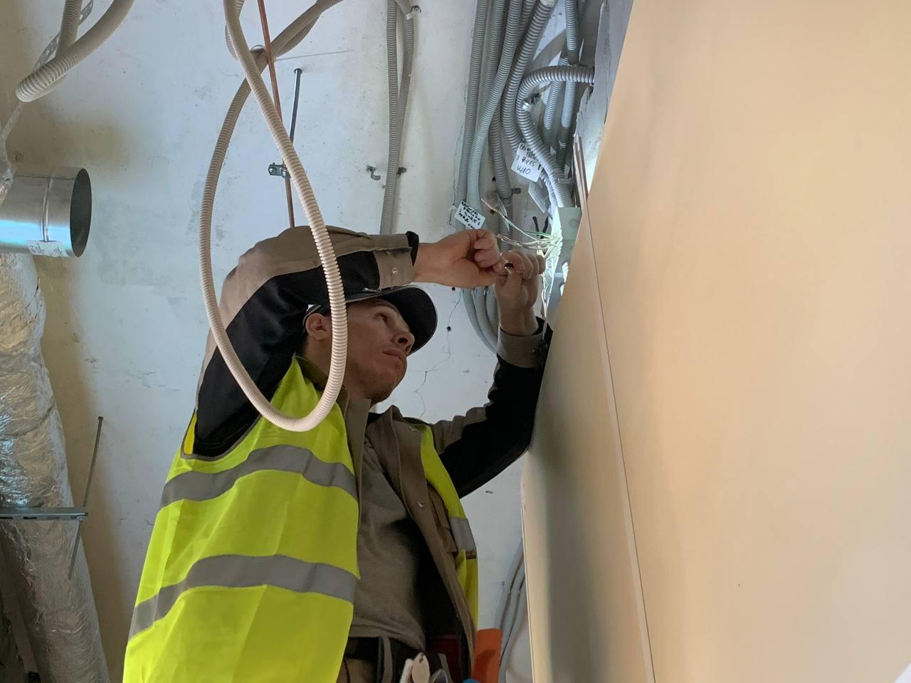 На основных этажах корпуса сейчас полным ходом идут отделочные работы. Специалисты укладывают напольное покрытие из керамогранита, монтируют настенную плитку в санузлах, а также устанавливают специальные HPL-панели, предназначенные для медицинских учреждений. Параллельно ведется прокладка всех инженерных систем: сантехники, электрики и вентиляции.
