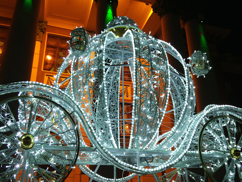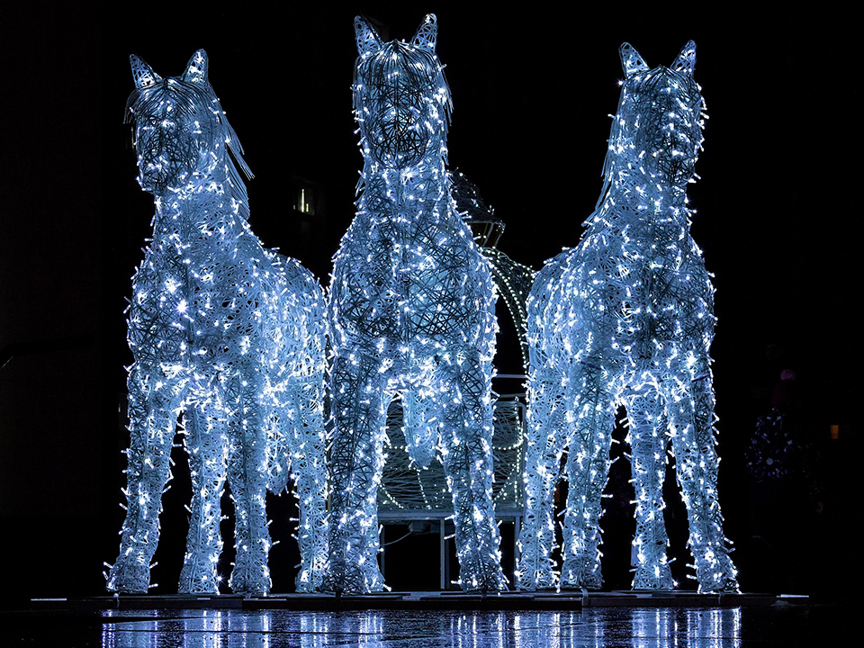 Особое внимание уделили площади перед Дворцом культуры. Здесь развернется сказочный сюжет: гостей будет ждать карета, запряженная тройкой лошадей, а фасад здания украсят консоли в виде часов и подарков. Дополнят картину два световых фонтана «Жемчужина» и четырнадцать живых елей в праздничном наряде.