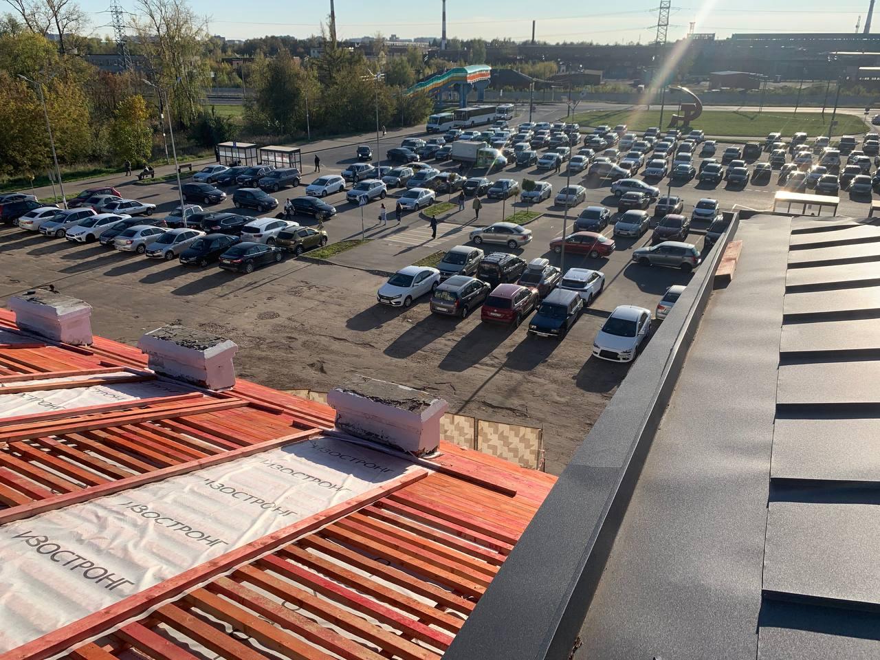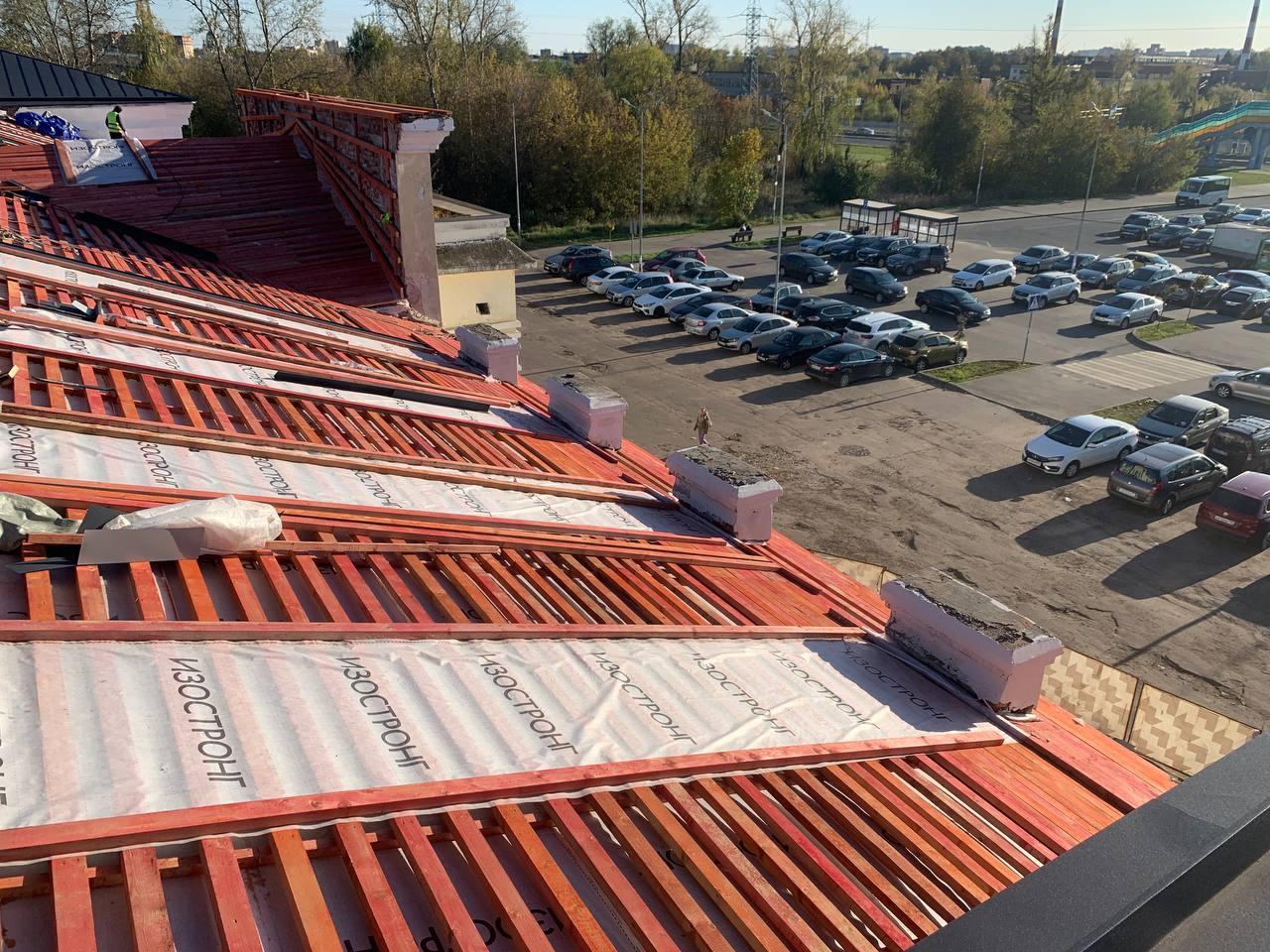 В настоящее время на объекте завершен демонтаж старых конструкций и возведена новая стропильная система. Специалисты монтируют гидро- и пароизоляцию и продолжают укладку нового кровельного покрытия на площади более тысячи квадратных метров. В скором времени здесь также будет установлена современная водосточная система.