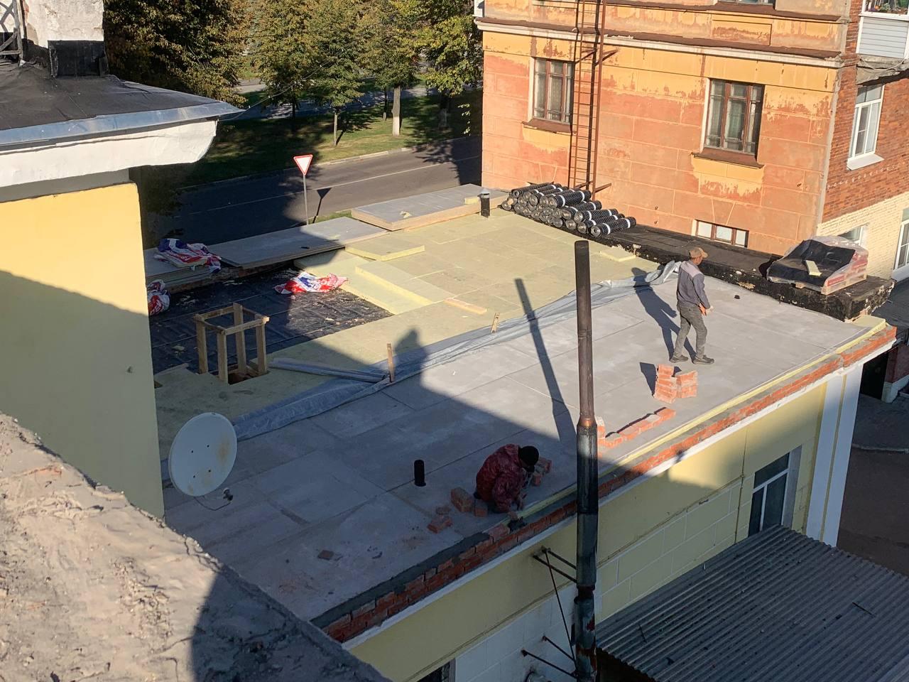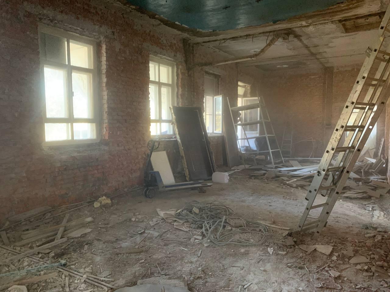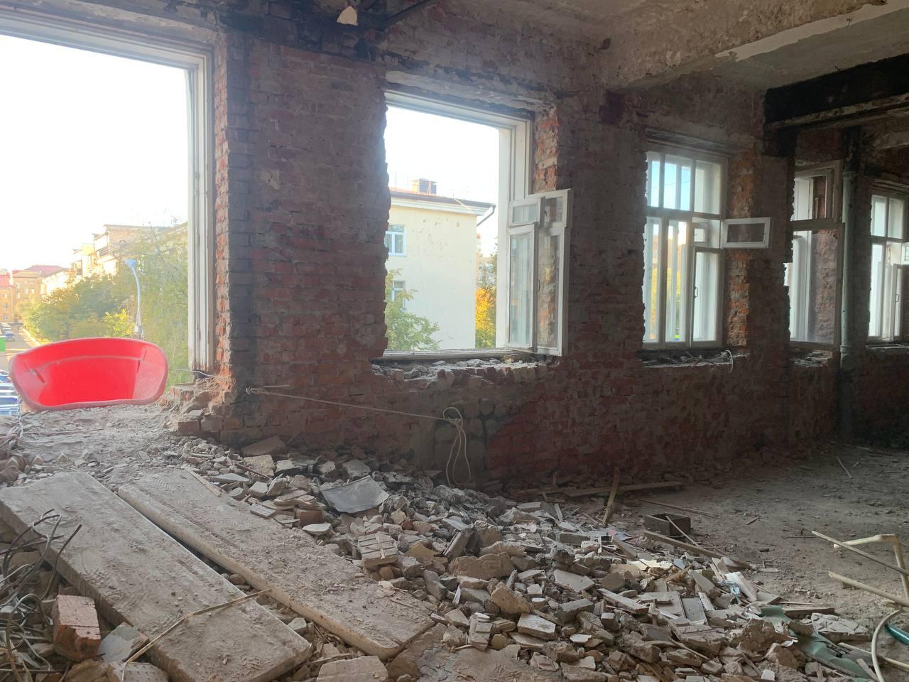 В настоящее время строители уже заменили плоские участки крыши и готовятся к монтажу новой стропильной системы для скатной кровли. Эти работы планируется завершить к концу октября. Одновременно на втором этаже был произведен полный демонтаж старой отделки в преддверии полной модернизации.