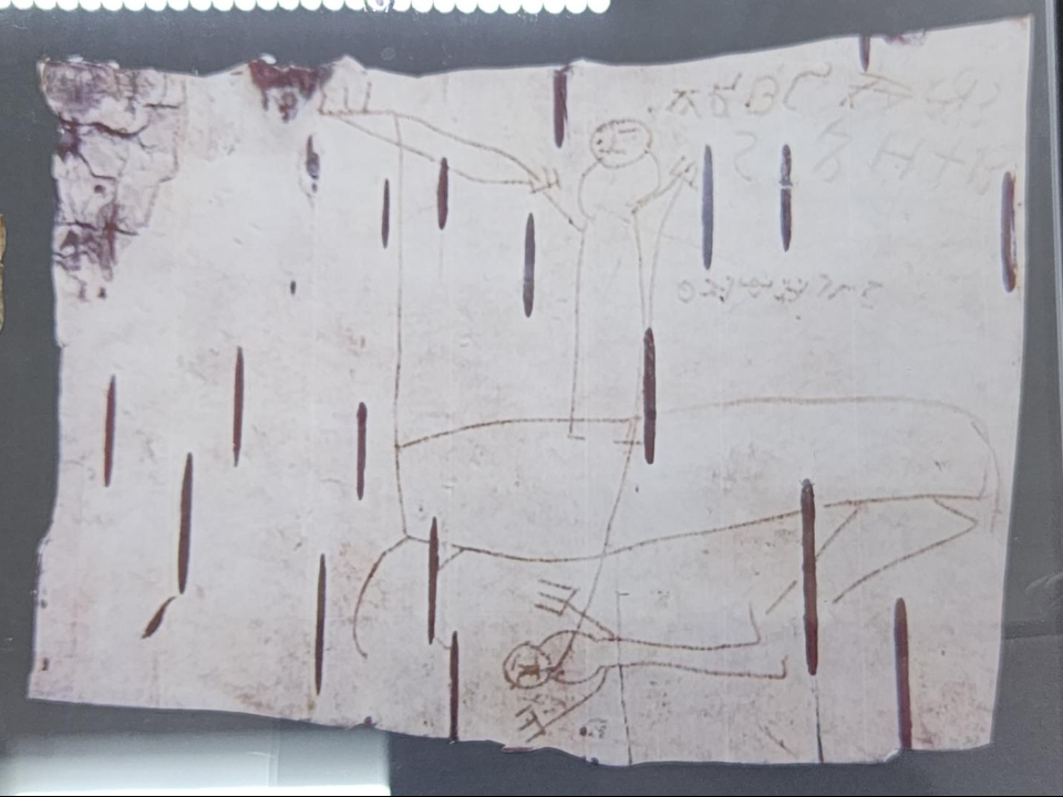 В музее можно также увидеть копию бересты мальчика Онфима, где ученик отвлекся от изучения азбуки и начал рисовать человечков, прям как рядовые школьники. Кого конкретно хотел изобразить Онфим, история умалчивает, но можно с уверенностью сказать, что и восемь веков назад дети не всегда внимательно слушали урок.