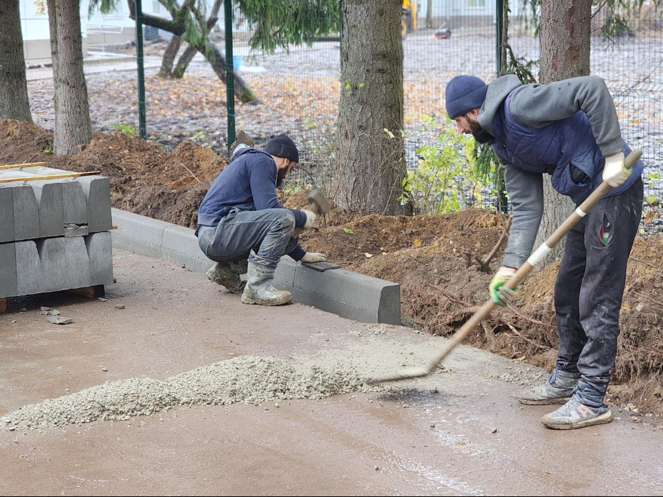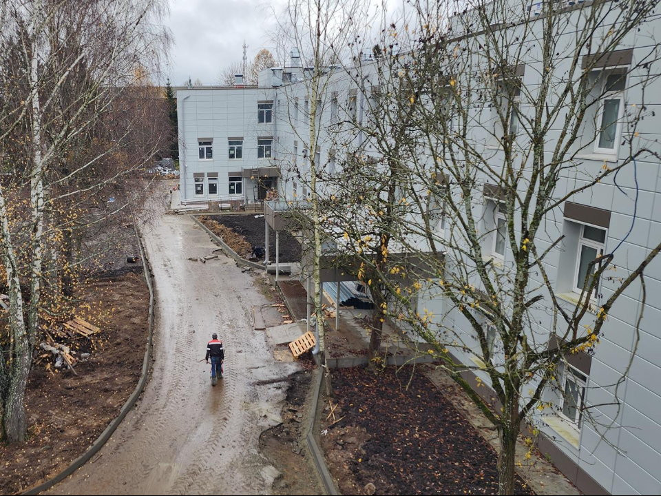 Вокруг здания больницы рабочие продолжают благоустройство прилегающей территории. Они закончили установку новых бордюров и теперь выравнивают грунт на будущих газонах. Скоро начнут монтаж перил на крыльце и лестницах больницы. Впереди также установка потолков, сантехники, светильников.