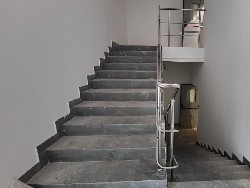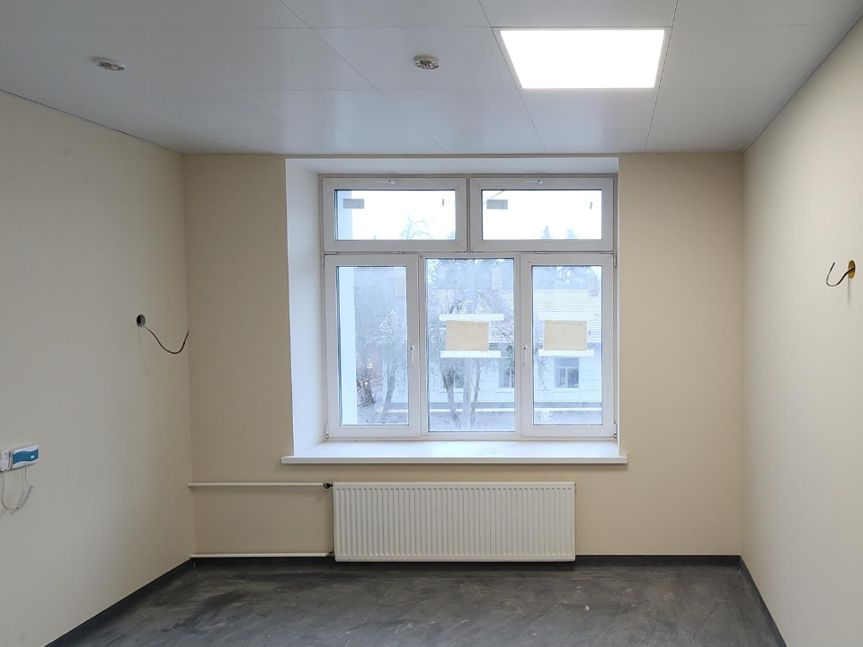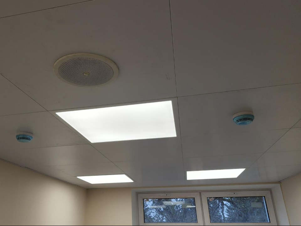 На первом и втором этажах строители пока монтируют подвесные потолки и элементы системы вентиляции. Завершается укладка линолеума на пол, сейчас рабочие соединяют его стыки специальным паяльником и шнуром. В помещениях, где уже завершили монтаж потолков и освещения, установили также извещатели пожарной сигнализации и динамики системы оповещения в случае ЧП.