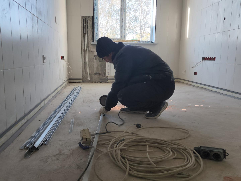 Внутри ФАПа в настоящее время полным ходом идут отделочные работы. После установки систем вентиляции и электроснабжения в помещениях начнут красить стены. Рабочие сейчас монтируют основу под подвесные потолки, делают откосы на окнах и дверях, укладывают плитку на полу и в санузлах.