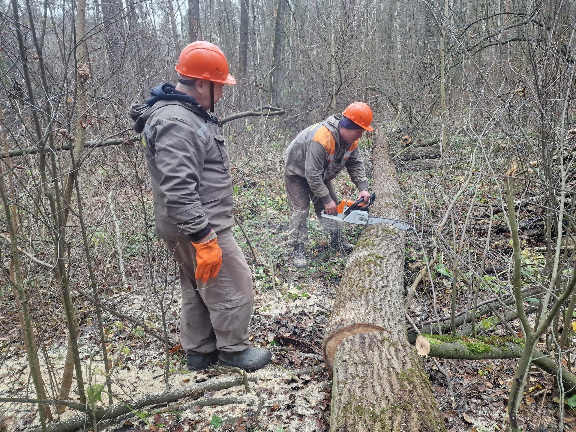 Перед началом уборки лесопатологи обследовали территорию и пометили зараженные деревья красными отметками. Такая древесина не просто захламляет лес — она опасна. Сухостой и бурелом могут стать причиной пожара. Также в них размножаются вредители, которые заражают здоровые деревья, а сваленные стволы мешают расти молодой поросли. Специалисты очищают территорию от этого мусора.