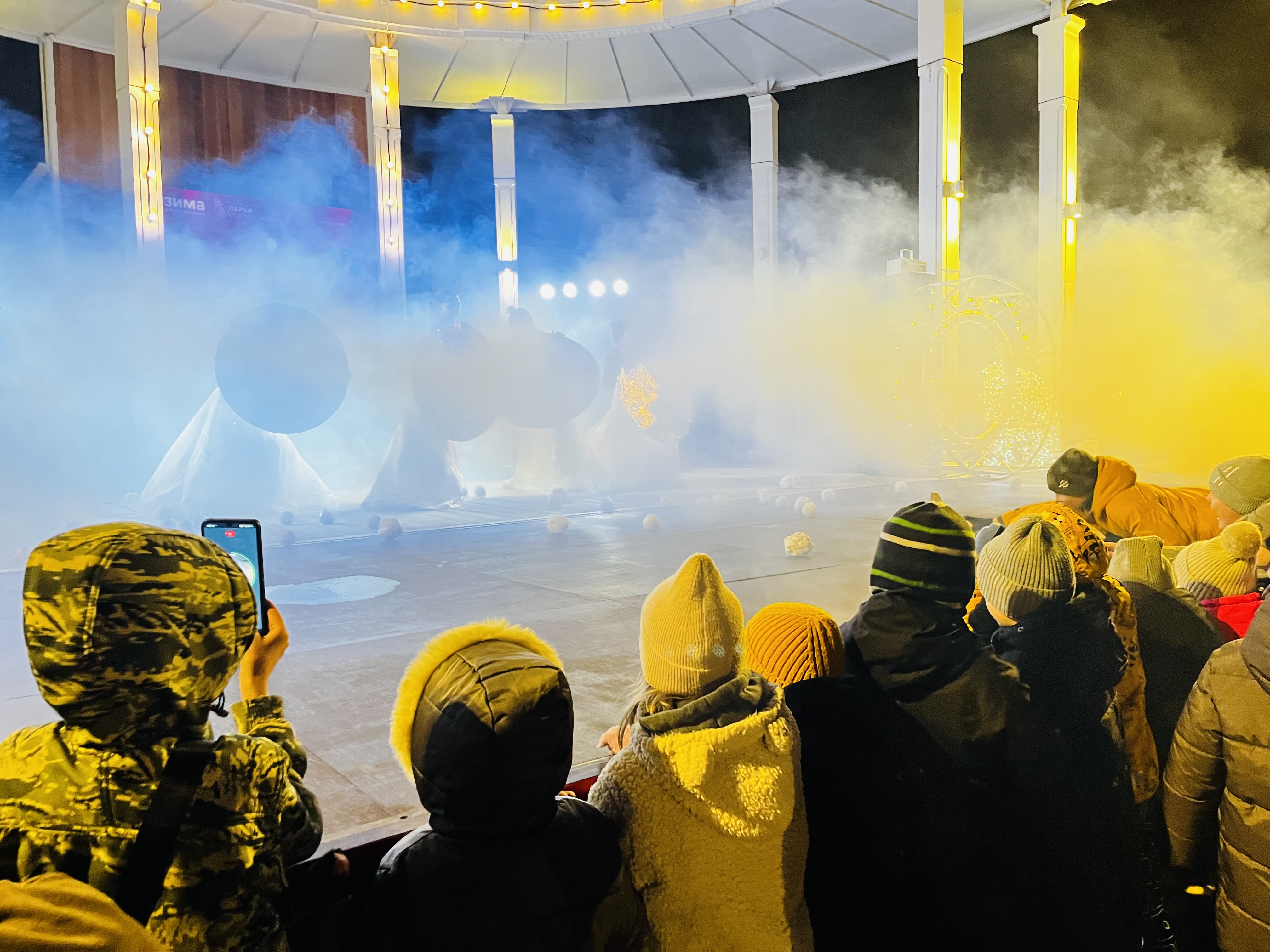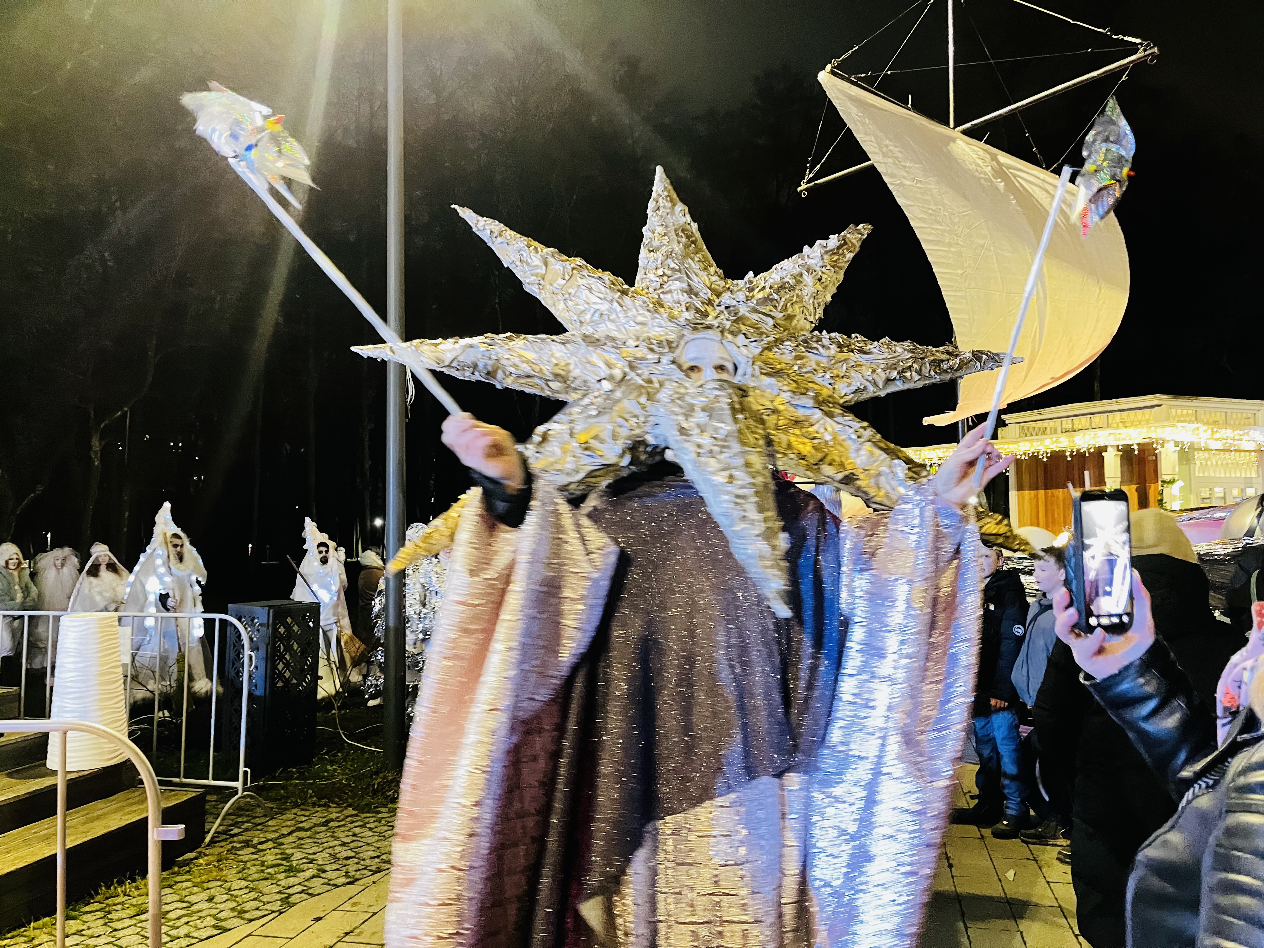 Спасти положение должен был волшебный корабль из Небесной канцелярии, который двигался по площади и производил искусственный снег, создавая зимнюю магию наяву. Этот сказочный спектакль был одноразовым — его больше не повторят, но идею гигантского снежка могут использовать в новогодних праздниках «Гуслицы», если снег так и не выпадет.
