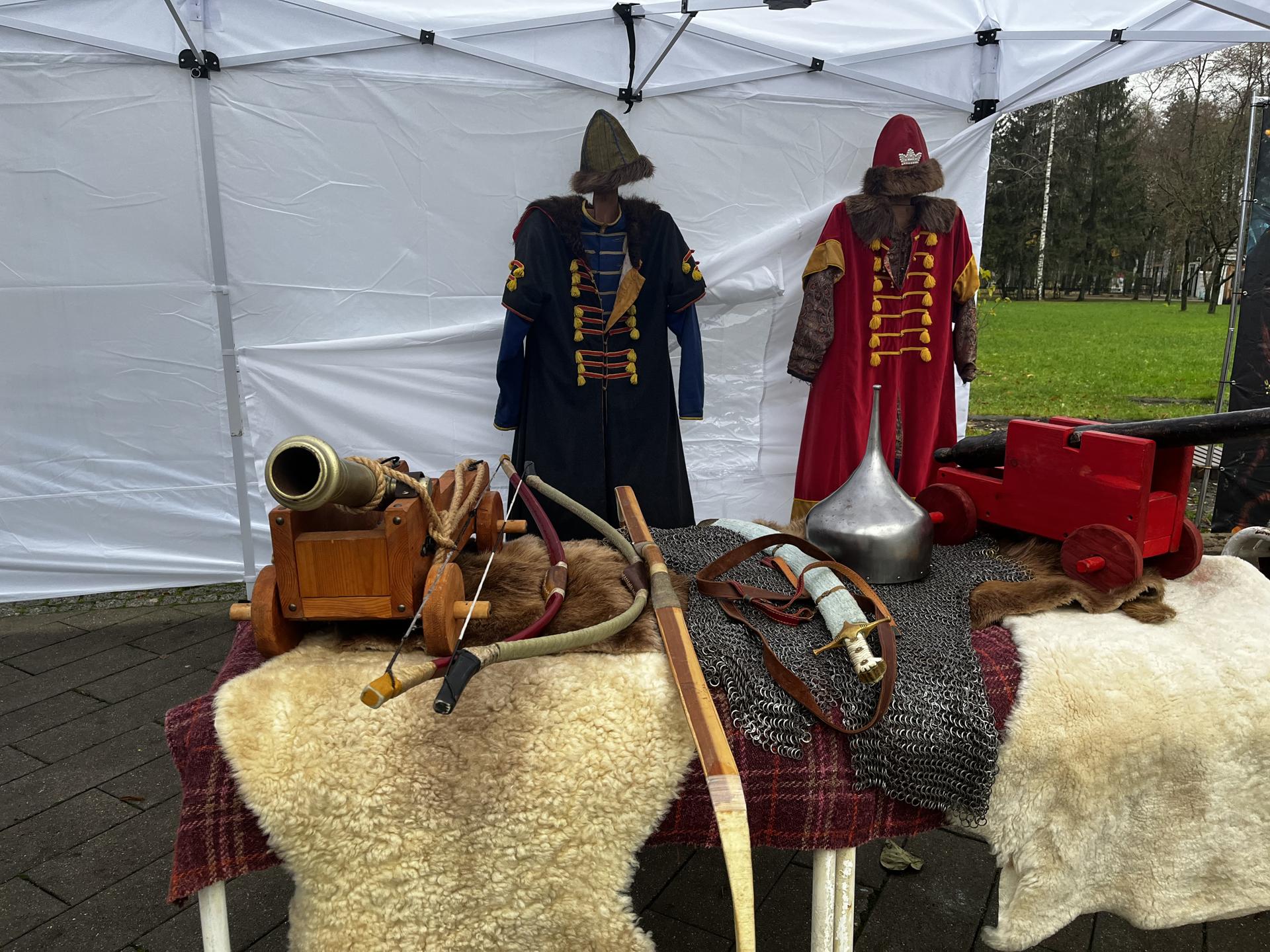 Гости парка могли в деталях рассмотреть доспехи и вооружение воинов X–XVII веков. Центральными экспонатами стали боярский костюм и обмундирование стрелецкого сотника, представленные на манекенах. Особый интерес вызвали копия старинной пушки-пищали, защитный головной убор — шелом, а также кольчуга, сабли и лук.