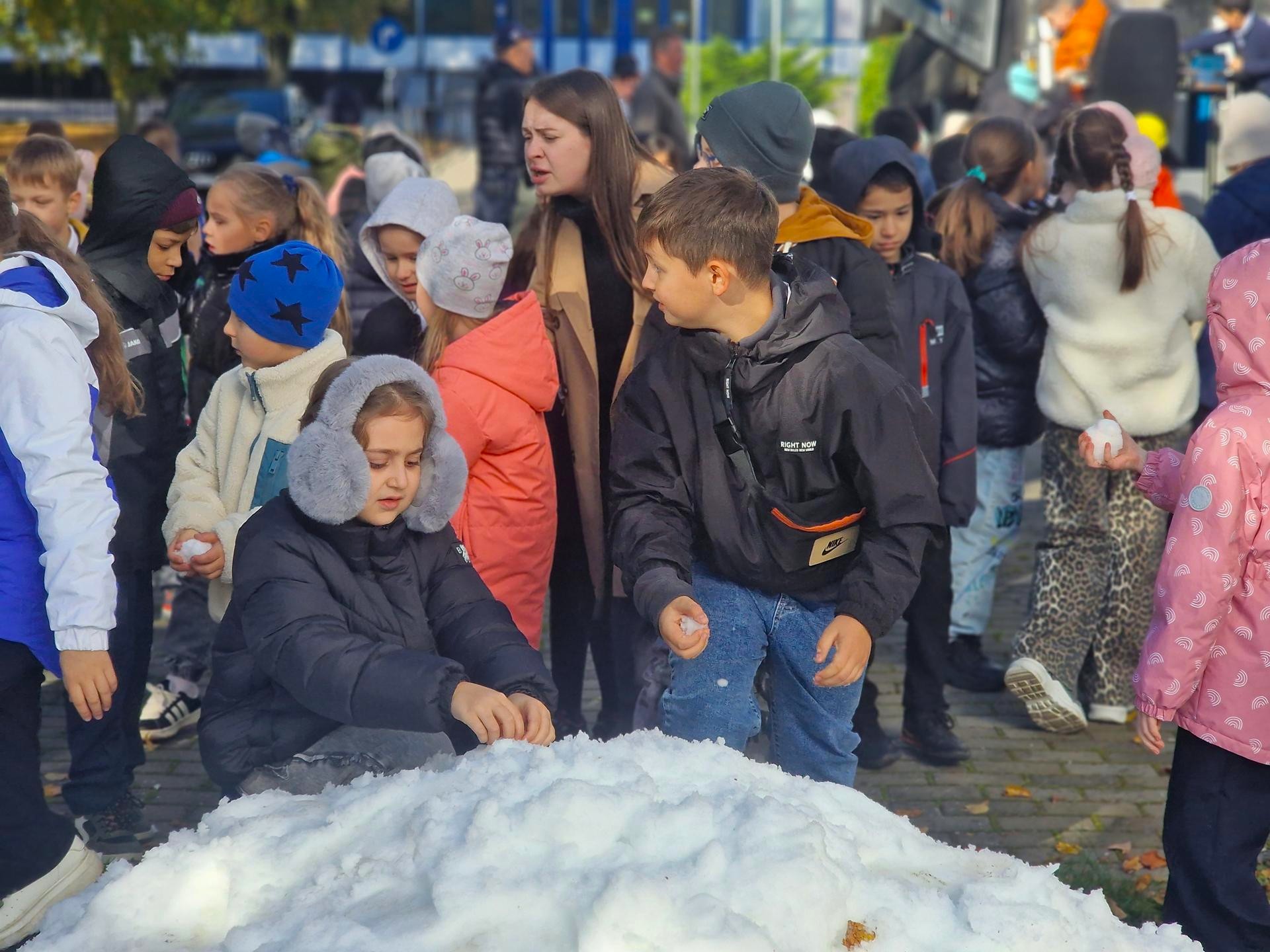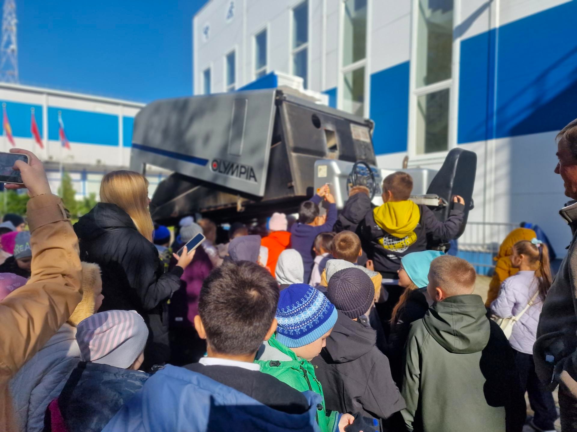 Заметив гостей, юные хоккеисты дружелюбно подбежали к борту, чтобы дать «пять» каждому. Экскурсия продолжилась во дворе ледового дворца, где детям продемонстрировали спецтехнику — машину для заливки льда.