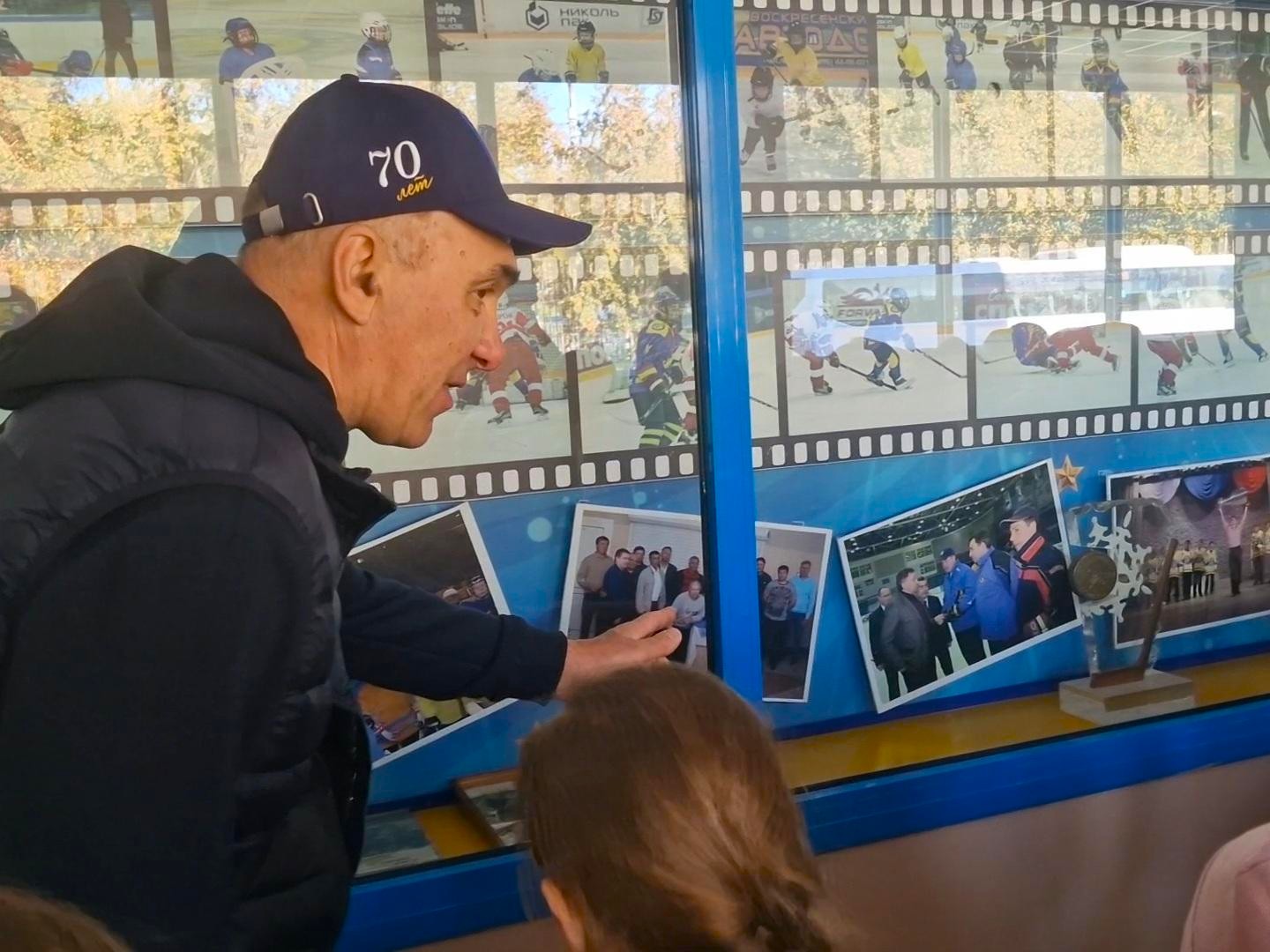 В фойе дворца дети разглядывали фотографии хоккеистов, кубки и медали. Им рассказали об истории воскресенского хоккея, который стал визитной карточкой города.