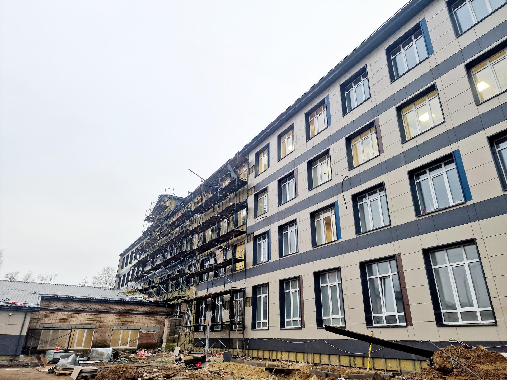 Во дворе для студентов установили новую спортивную площадку со специальным покрытием. Внутри здания на первом этаже продолжаются отделочные работы. Специалисты красят стены и укладывают линолеум в учебных помещениях, актовом и спортивном залах. Работы на втором, третьем и четвертом этажах завершены — здесь идет сборка и расстановка новой мебели.