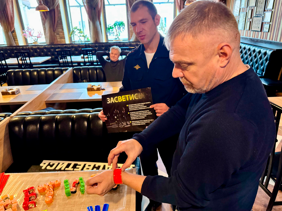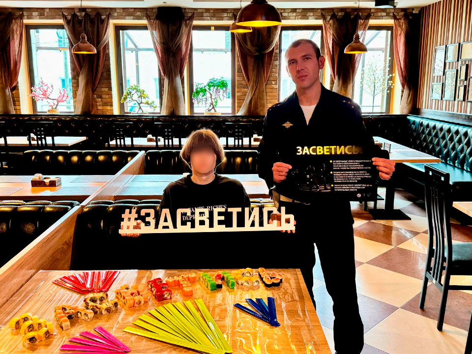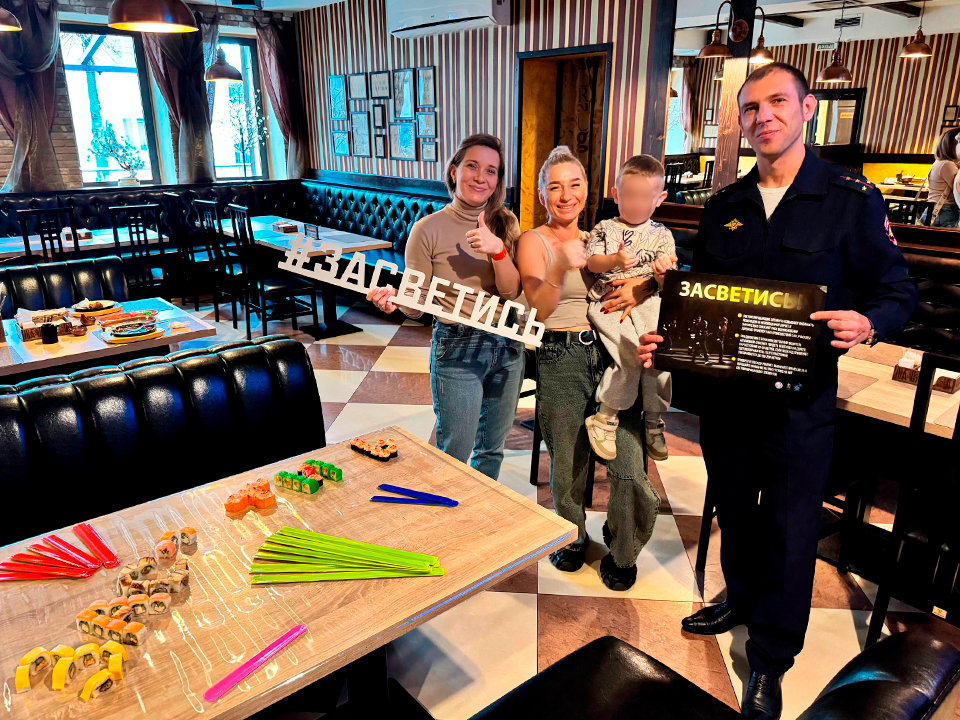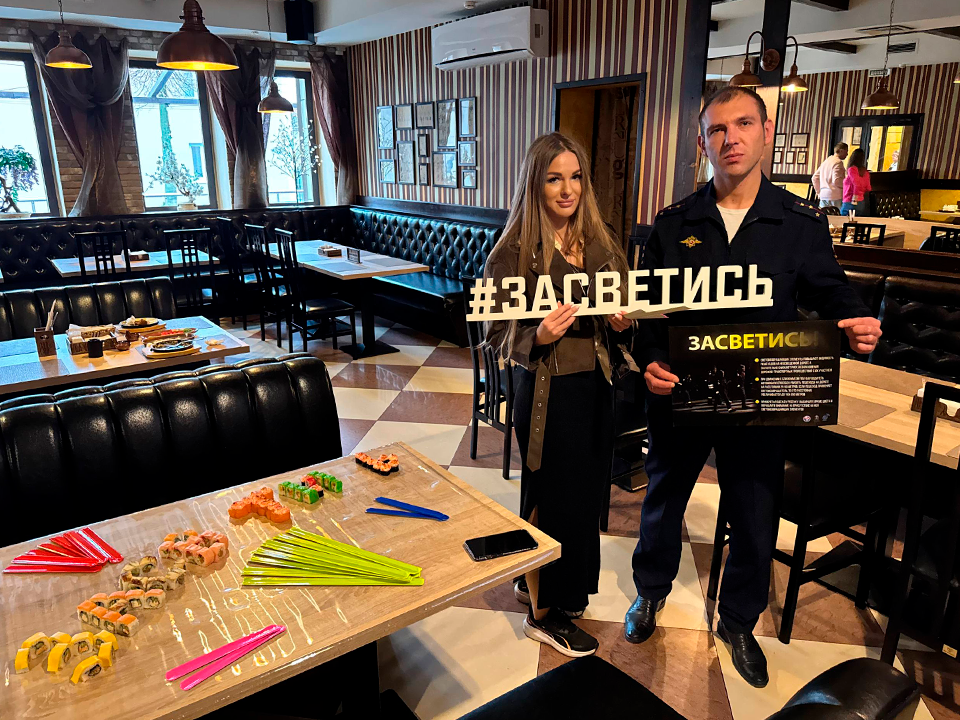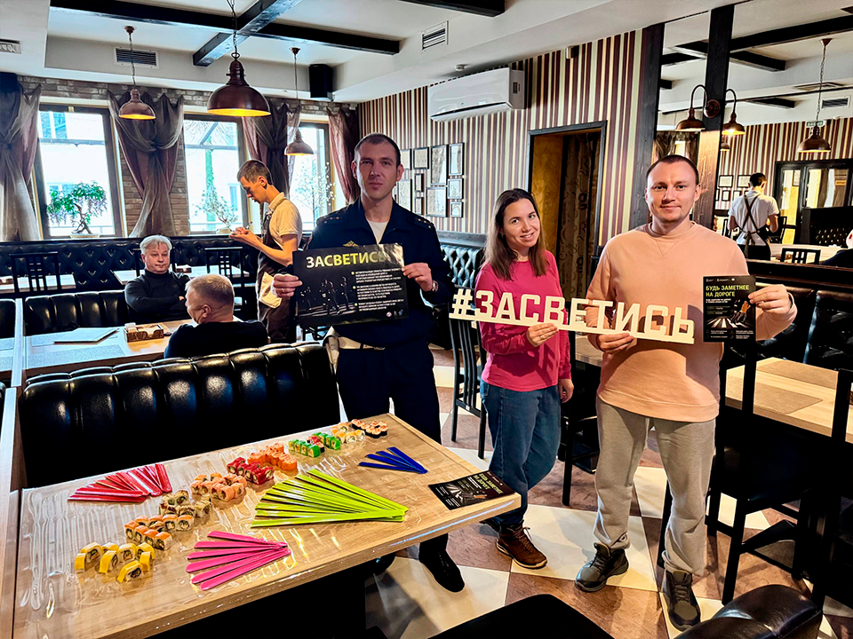 Вкусный арт-объект с социальным призывом «Засветись!» был создан из популярных блюд японской кухни. Акцию, организованную совместно с владельцами заведения, направили на популяризацию ношения световозвращателей в темное время суток. В ходе презентации стражи правопорядка не только разъясняли посетителям правила безопасности, но и вручали им полезные подарки — световозвращающие браслеты. А сотрудники ресторана угощали гостей роллами, использованными в инсталляции.