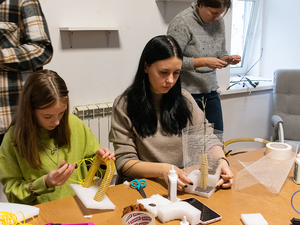 Дети и родители творили из гофрированных труб, поролона, проволоки и веток. Одна из участниц, Валентина Неврединова, назвала свое творение «Сердце в мусорном мешке».