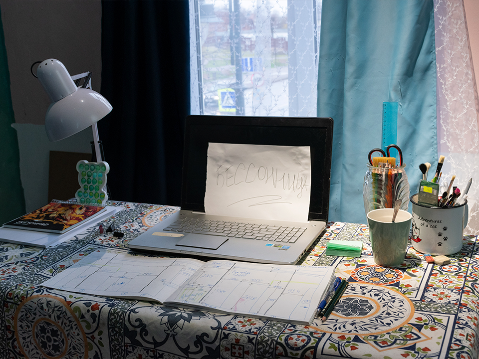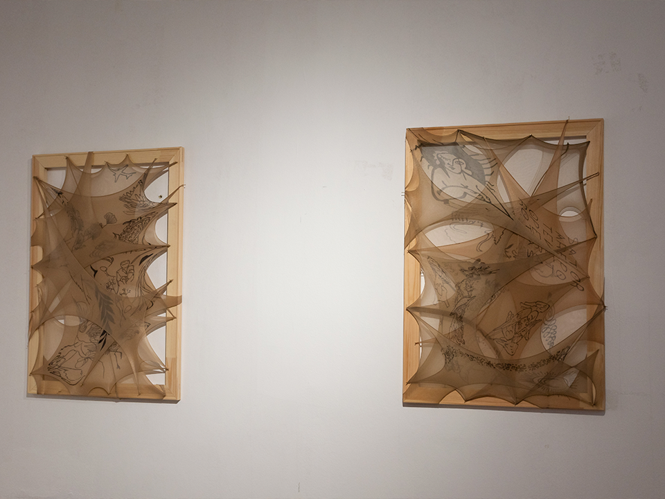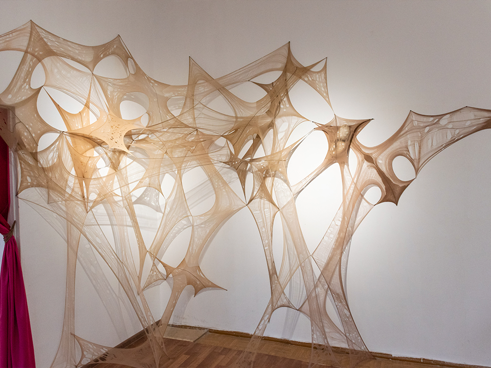 Еще одна художница, уже занявшая свою мастерскую — Елена Сурова из Москвы. Она исследует культурные коды и стандарты женской красоты, превращая найденные вещи и одежду в материал о размышлении на тему телесности и внутренней трансформации. В угле своей мастерской она разместила «паутину» из капроновых колготок, в которой сидят «бэби-монстры».