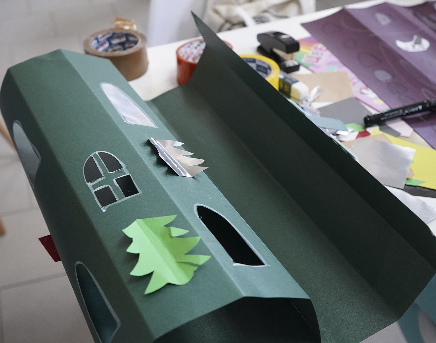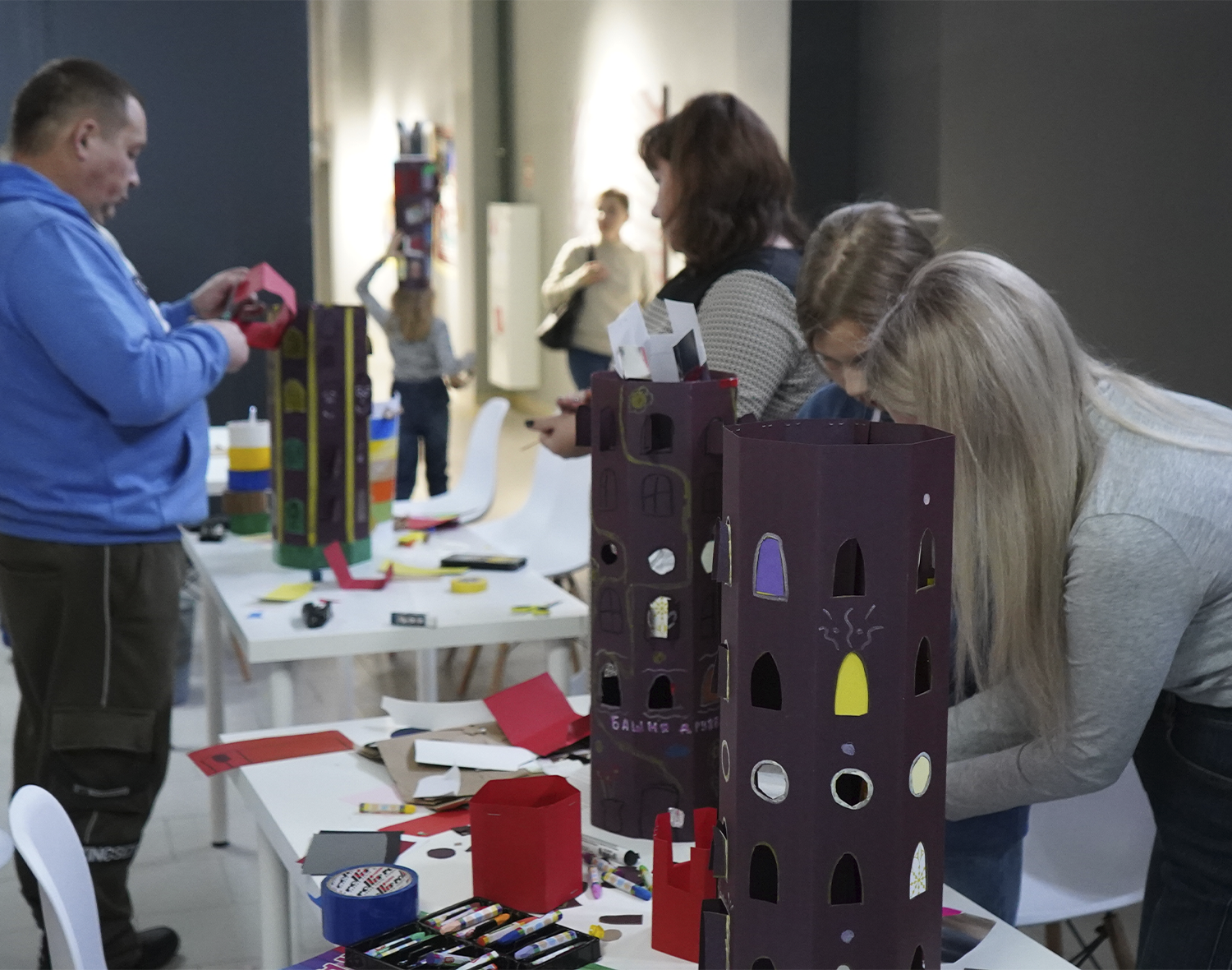 За основу ребята взяли картонные восьмиугольники. Каждый увидел башню по-своему. В одних руках она стала «башней друзей», из окон которой выглядывают жители. У кого-то из окон выпрыгивали «чертики из табакерки», где-то поселились коты, а фасад каждый украсил собственным орнаментом и украшениями всех цветов.