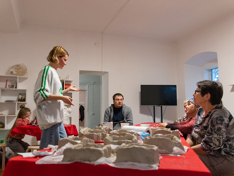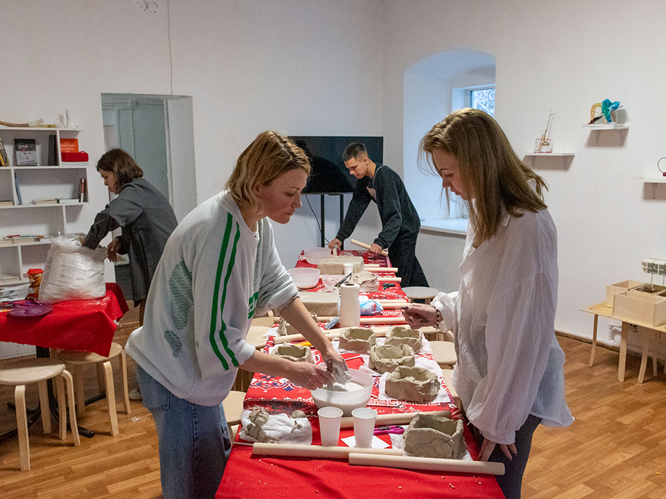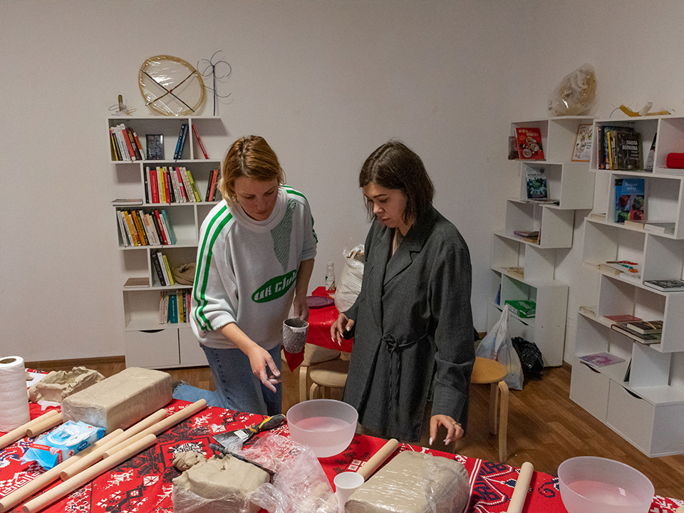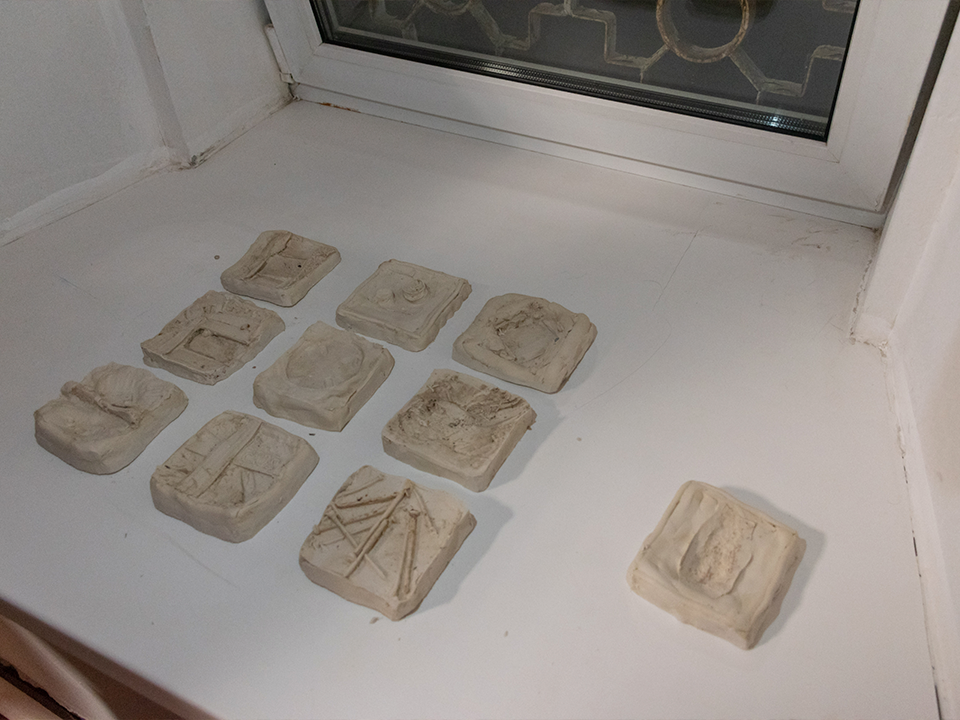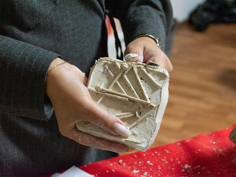 Кроме того, Гарай провела мастер-класс «Память вещей». Участники создавали барельефы, вдохновленные архитектурой и атмосферой Дома Мачтета. За вдохновением они отправились на третий этаж здания, где с помощью глины они сделали слепки понравившихся предметов, будь то гвозди, шпингалет или деревянная текстура стропил.