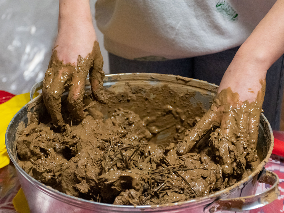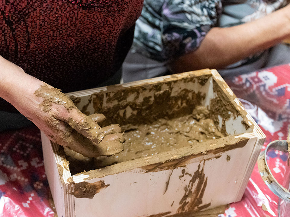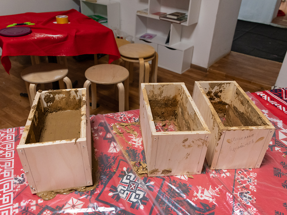 Сам проект, как рассказала художница, стоит из нескольких частей. Первая из них — это инсталляция из глинобитных кирпичей. Именно для них-то и нужна была глина и песок, а заодно и солома, играющая роль армирования. С помощью формы участники серии встреч должны будут сделать 40 кирпичей, которые и образуют исталляцию.
