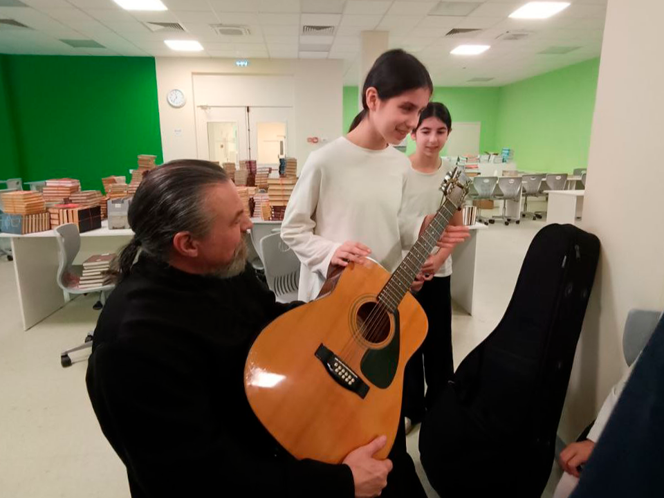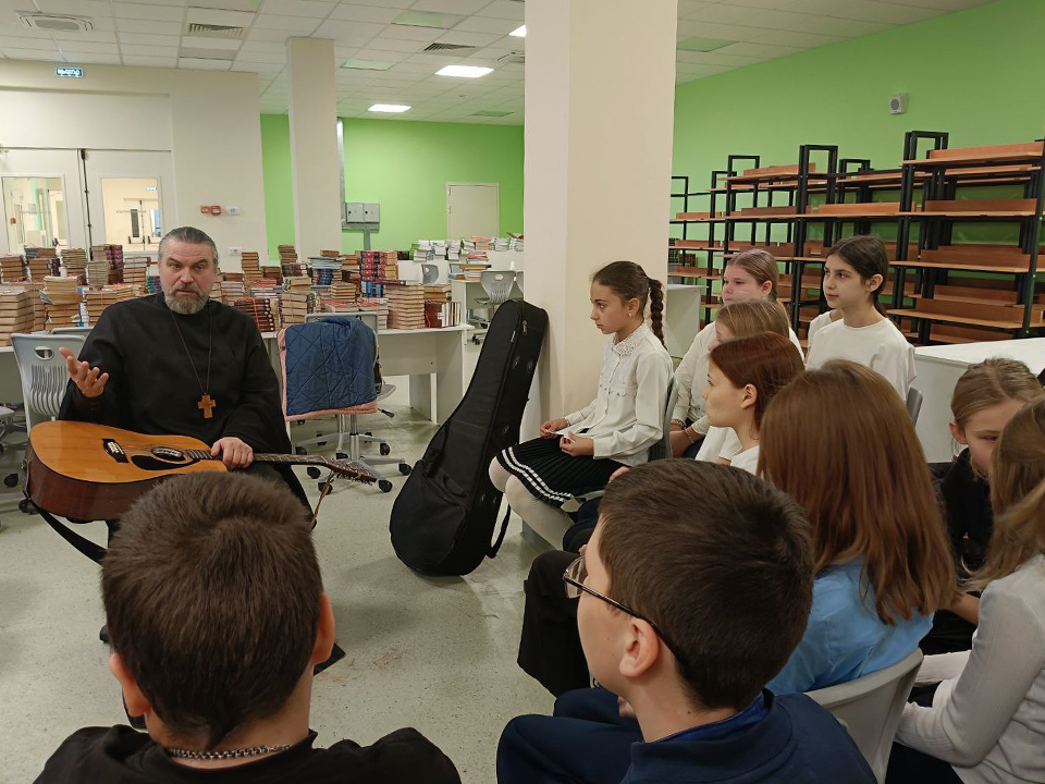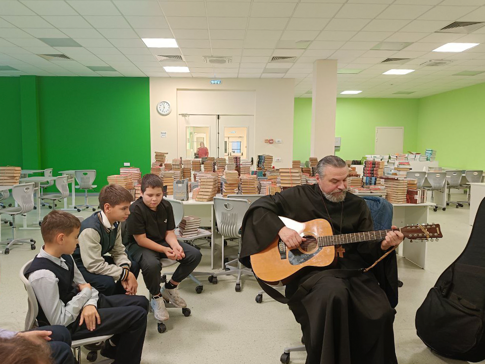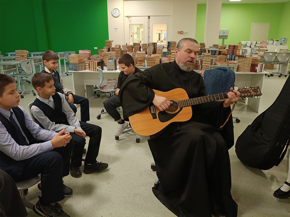 Отец Григорий подробно рассказал подросткам о своем призвании, церковном служении и творческом процессе. Особый интерес у аудитории вызвал его рассказ о том, как рождаются песни — каким образом поэтические тексты обретают музыкальное оформление.