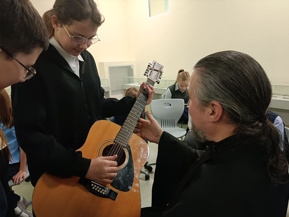 На встрече, прошедшей в дружеской атмосфере, учащиеся 10 и 5 «А» классов смогли пообщаться со священником в неформальной обстановке. Школьники задавали гостю разнообразные вопросы, касающиеся его жизненного пути, выбора священнического служения и музыкального творчества.