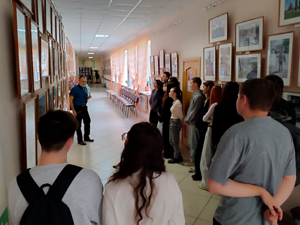 Учащиеся группы ТГ-311 познакомились с работами воспитанников фотостудии «Репортер» и ее руководителя Сергея Петрухина. Экспозиция включала снимки, посвященные Зарайскому краю, часть из которых была приурочена к 80-летию Победы в Великой Отечественной войне и запечатлела моменты празднования 9 Мая.