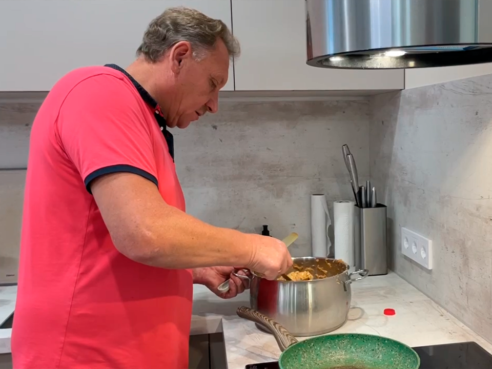 Петрущенко сразу предупредил, что продукты он берет на глаз, но REGIONS подсчитал, что яблок было более 10, а яиц — 11 шт. Также в составе присутствуют соль и сахар по вкусу, и также несколько сотен грамм пшеничной муки, сода и две столовые ложки сметаны, которой гасят соду. Из специй — корица.