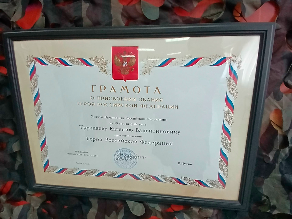 Герой России Евгений Трундаев погиб при исполнении воинского долга 15 октября 2014 года. Память о нем сохраняется его товарищами, семьей и всеми жителями Зарайска.