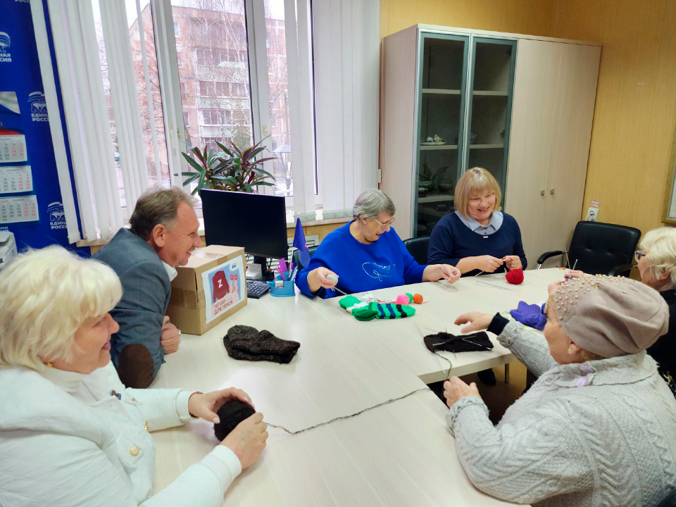 Особую активность проявляют представители старшего поколения. Участники программы «Активное долголетие», например, организовали собственную мастерскую по вязанию теплых шерстяных носков для защитников.