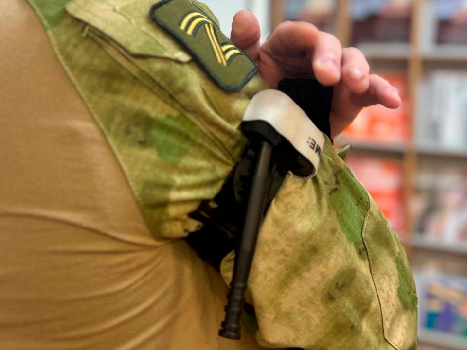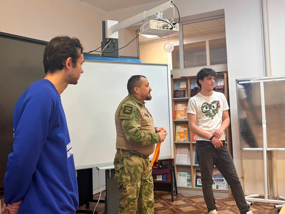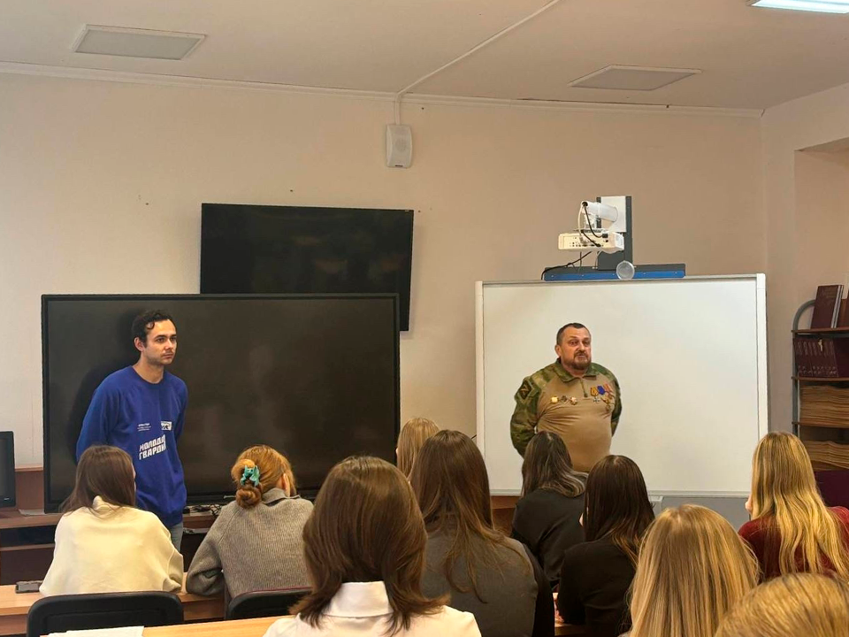 Перед будущими педагогами выступил ветеран СВО, боец добровольческого подразделения «ГРОМ «Каскад» Владимир Макаров. Он не только поделился личным опытом службы, но и провел для студентов мастер-класс по оказанию экстренной медицинской помощи. Участники мероприятия на практике отработали применение армейского жгута и турникета, получив важные прикладные навыки.