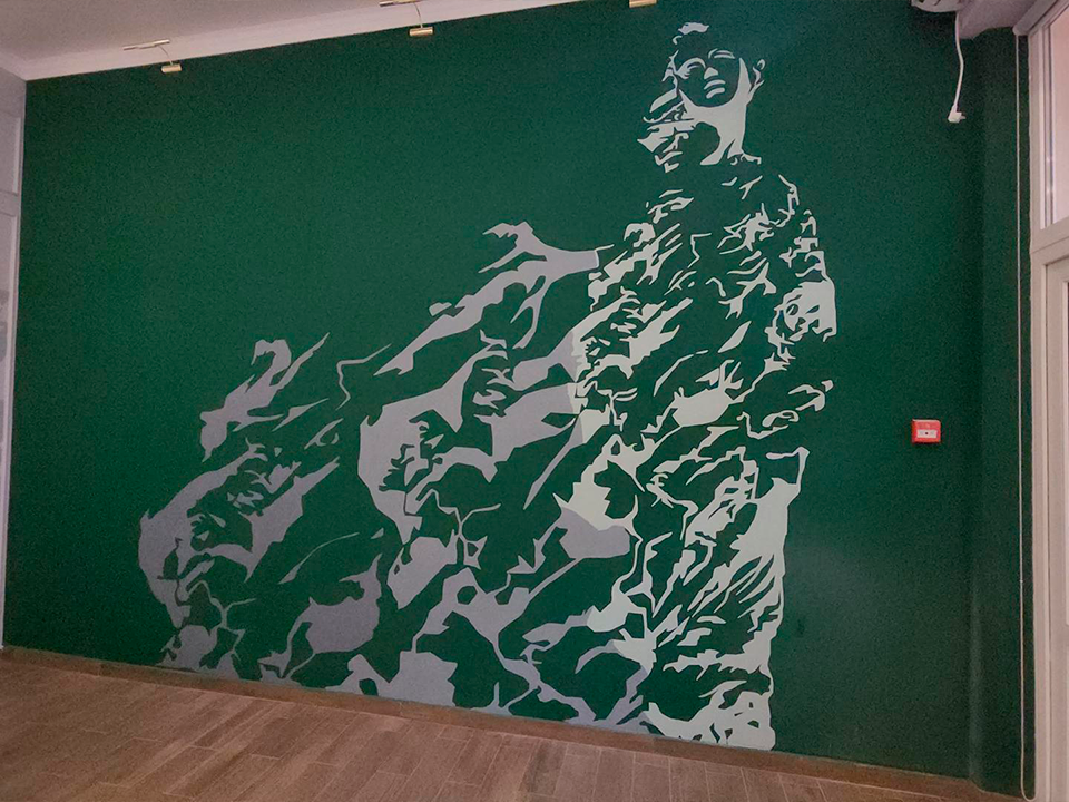 Материальное воплощение идеи выполнил местный художник Борис Елунин. Он собственноручно перенес на стены цитаты и образы, предложенные дизайнером, создав уникальное арт-пространство.
