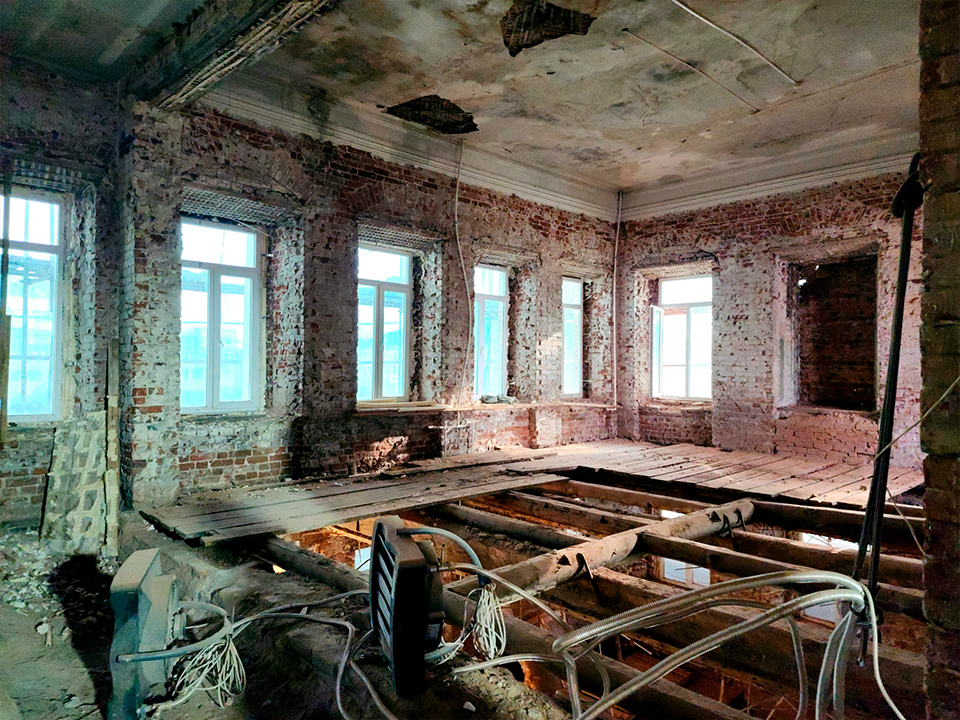 В настоящее время подрядчики завершили черновой этап: демонтированы старые конструкции и укреплен фундамент. Выполнено более 75% работ по замене кровли, а реставрация фасада ведется с ювелирной точностью для сохранения аутентичного облика.