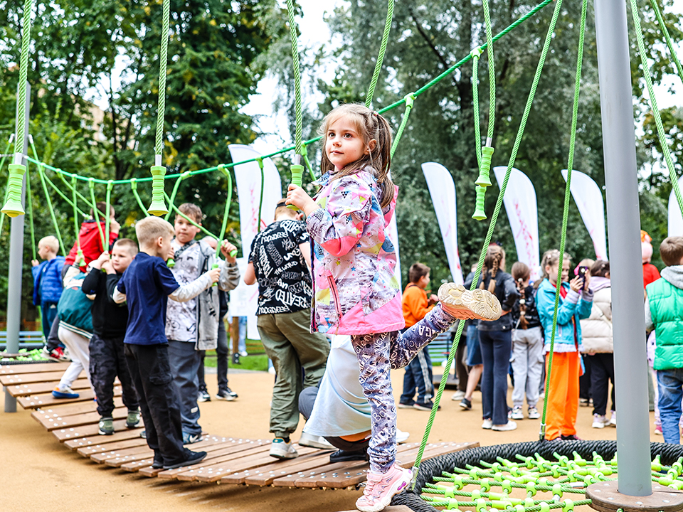 Оригинальная площадка появилась на улице Вокзальной в Красногорске. Она оборудована канатным комплексом, соединенным между собой переходами. Это позволяет детям исследовать пространство, развивать координацию и силу.