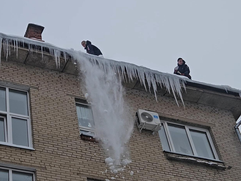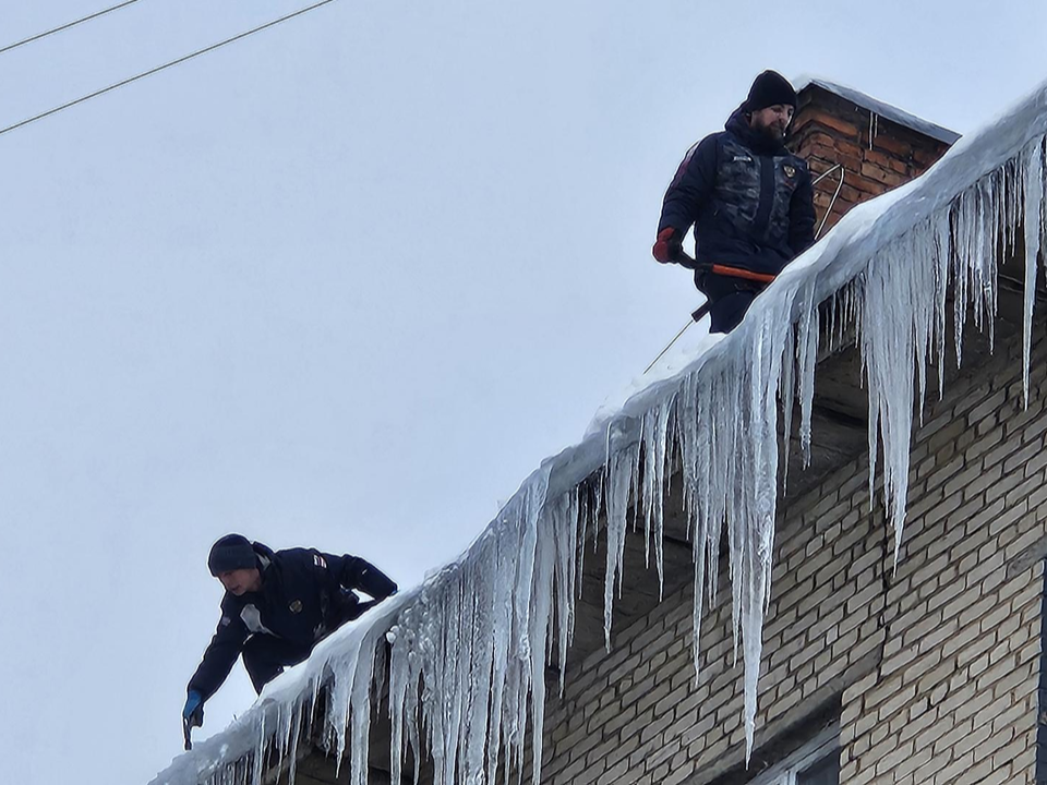Рабочие очистили крышу жилого здания от скопления снега и внушительных сосулек. Вооружившись лопатами и ледорубами, специалисты аккуратно удалили снежную массу и сбили ледяные образования по периметру кровли.
